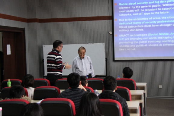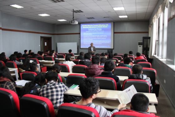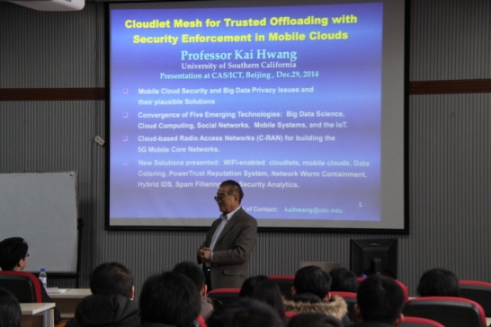 2015年1月13日上午,应公司EMC易倍经理魏晓辉教授的邀请,美国南加州大学电气工程与计算机科学系黄铠教授来校进行学术访问与交流,并做题为“移动云计算中的信任转移安全基础设施”的报告。
