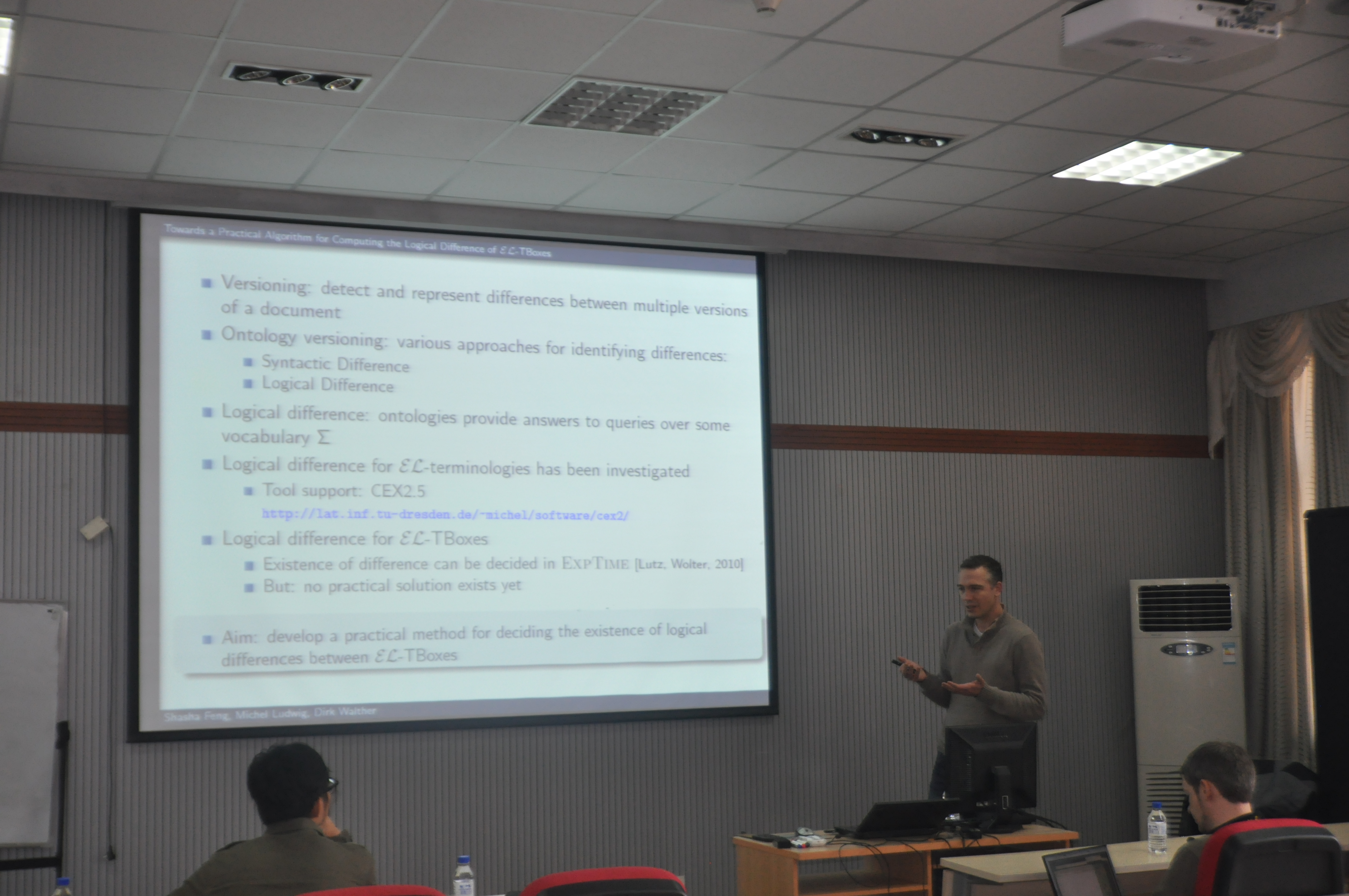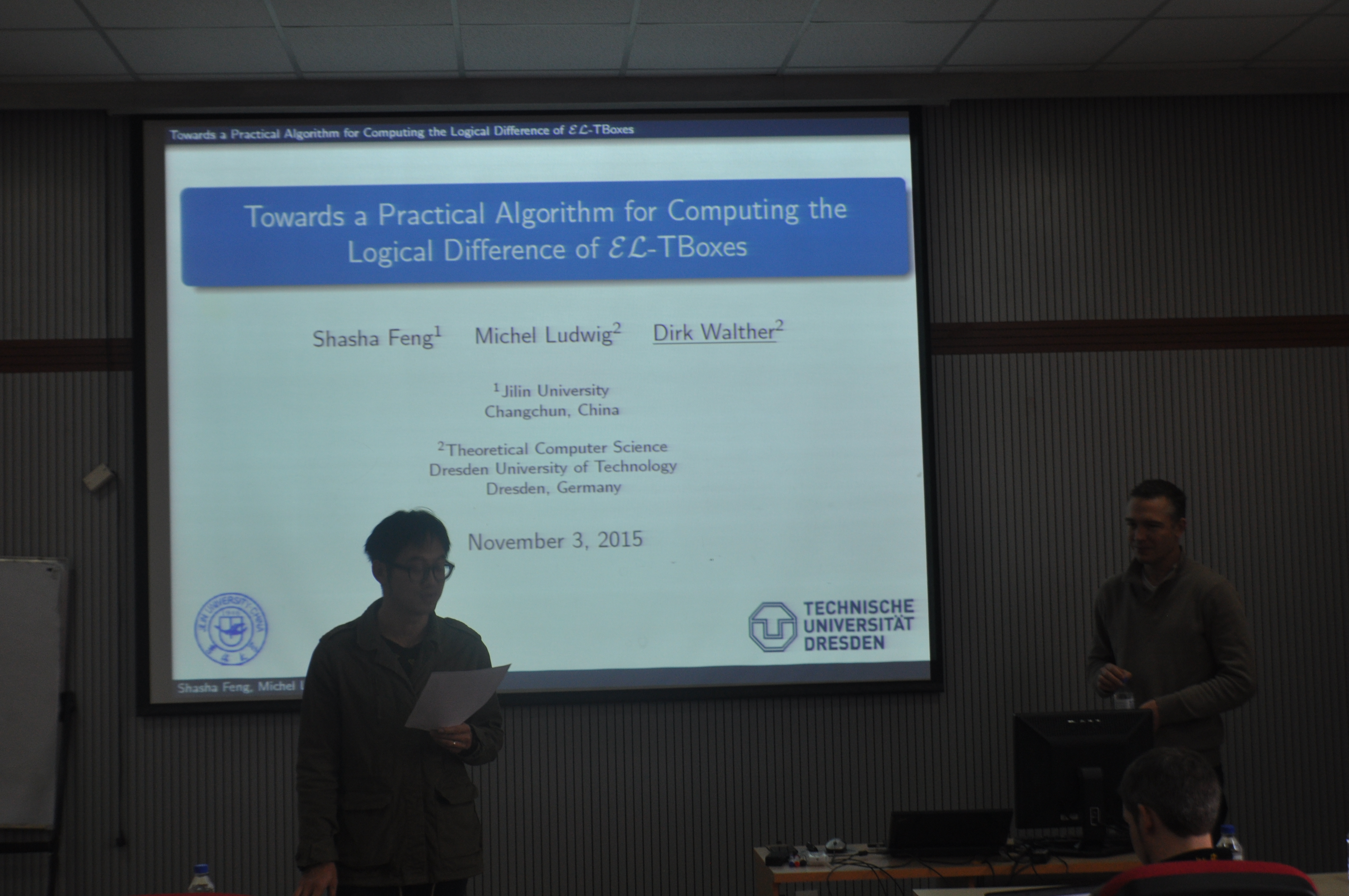近日,德国德累斯顿工业大学Dirk Walther博士应EMC易倍张睿老师邀请来公司进行为期两周的学术交流活动。此次学术访问由EMC易倍官网国际处的青年骨干教师引智培育计划项目资助。 2015年11月3日上午,Dirk Walther博士做题为“寻找计算EL-TBoxes逻辑差的实用算法”的学术报告。