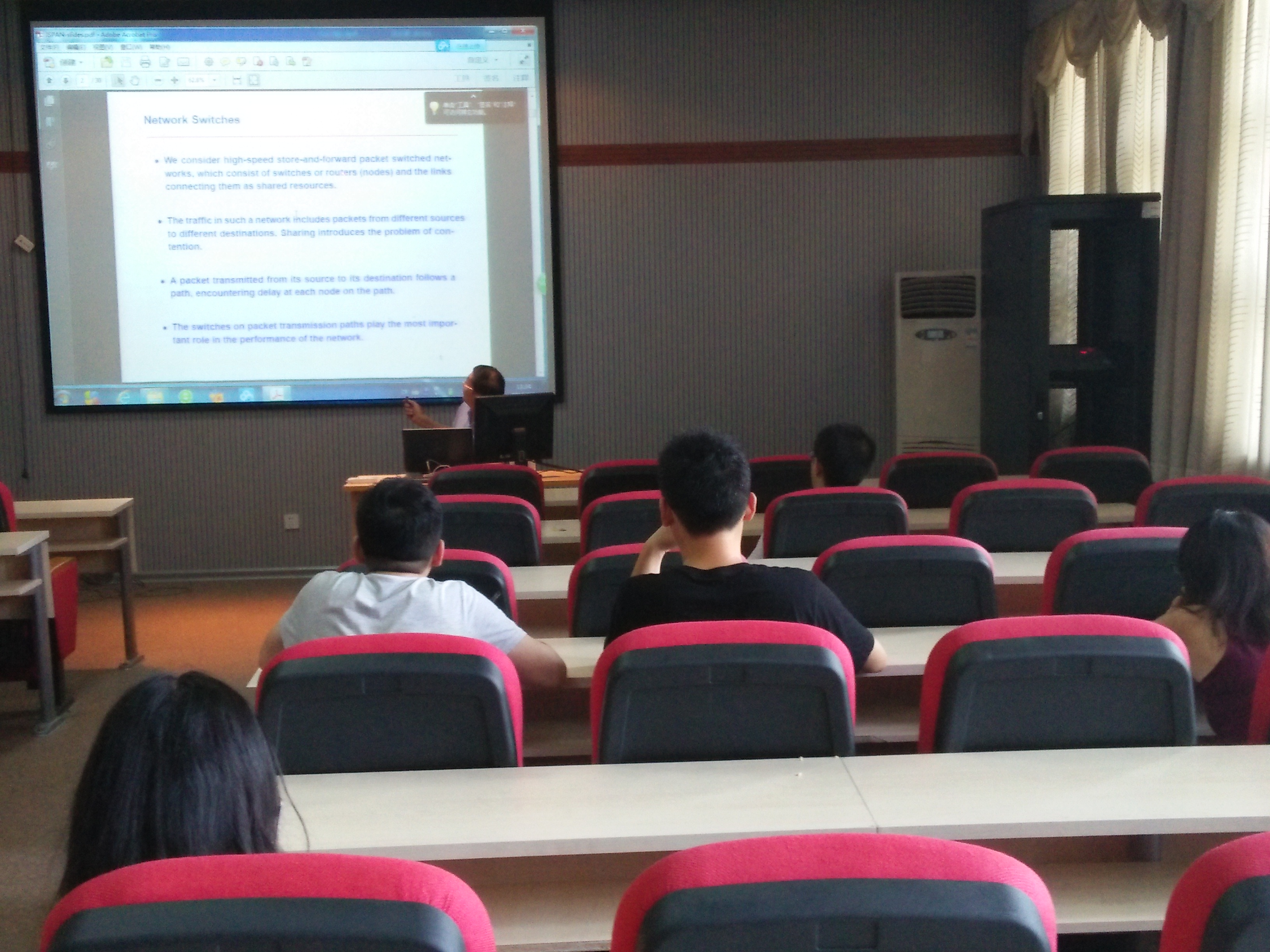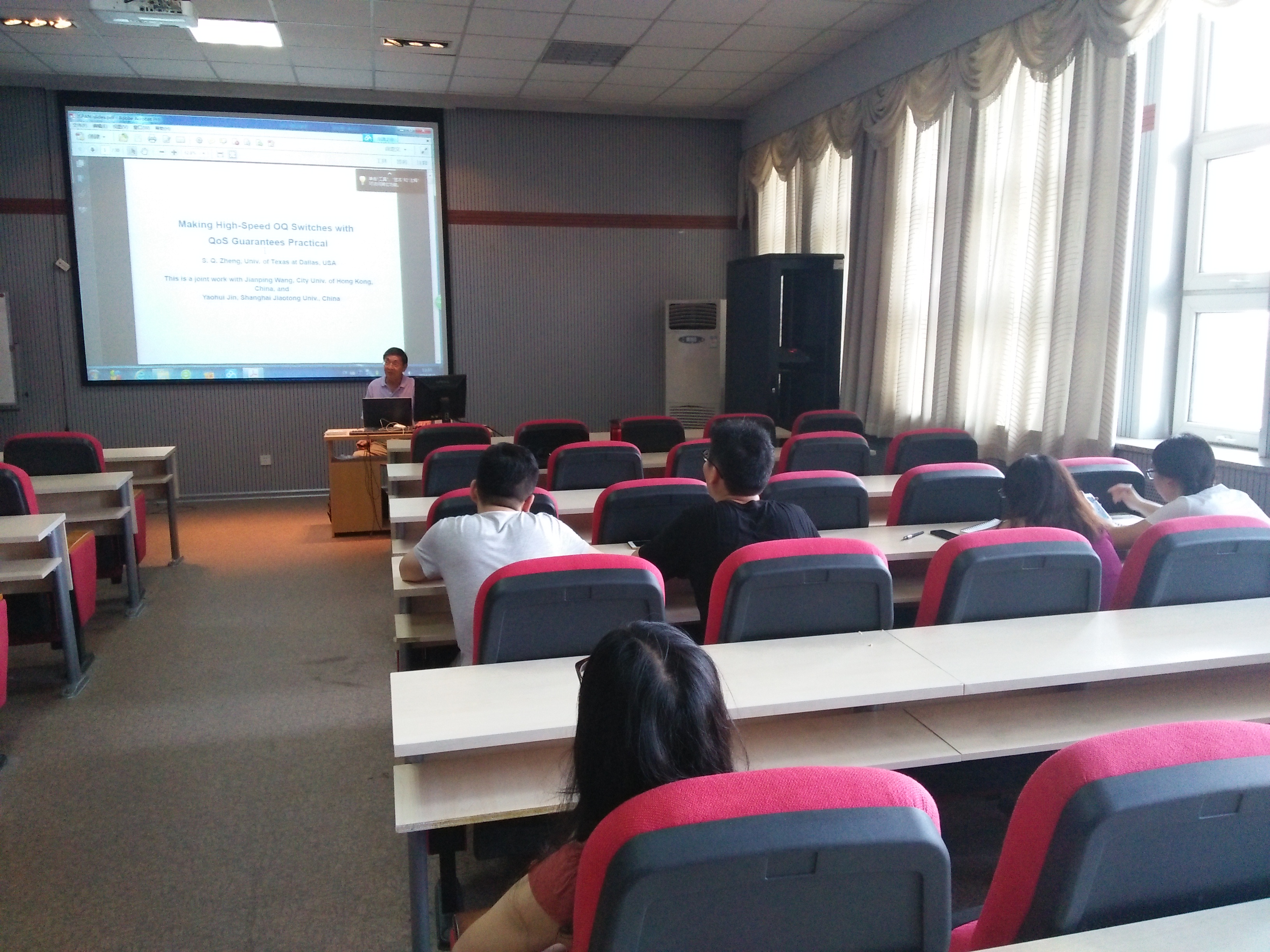 2016年8月4日下午13:30, 美国德州大学达拉斯分校终身教授、唐敖庆讲座教授郑斯清教授在EMC易倍A521报告厅为计算机公司和软件公司的青年教师和研究生做了题为“Making High-Speed OQ Switches with QoS Guarantees Feasible”的学术讲座。该讲座的主要内容源于近期郑斯清教授与香港城市大学、上海交通大学合作研究的学术成果 – 构建易实现的高速输出排队交换结构。郑斯清教授同时在报告中讲解了研究和开发高速和可扩展交换结构的技术难点,以及介绍了该方面近十年的研究进展。整个讲座大约持续3个小时,分为两个阶段,主讲阶段约进行2个小时。主讲结束后,郑斯清老师解答了同学们提出的该方面的相关问题,同时,和同学们讨论了学术研究过程中寻找课题、研究方法等。
