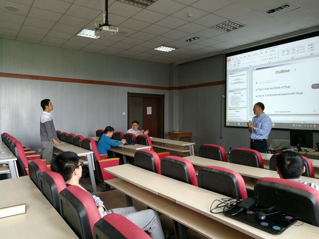 报告最后,Neng-Fa Zhou教授与现场师生进行了探讨交流,就Picat、约束、SAT等问题进行了充分的讨论,为现场师生进行相关方向的研究提供了较好和较新的思路。在互动中,员工加深了对Picat的了解和认识。最后整个讲座在热烈的掌声当中结束,参加此次报告的同学们均表示收获颇丰。