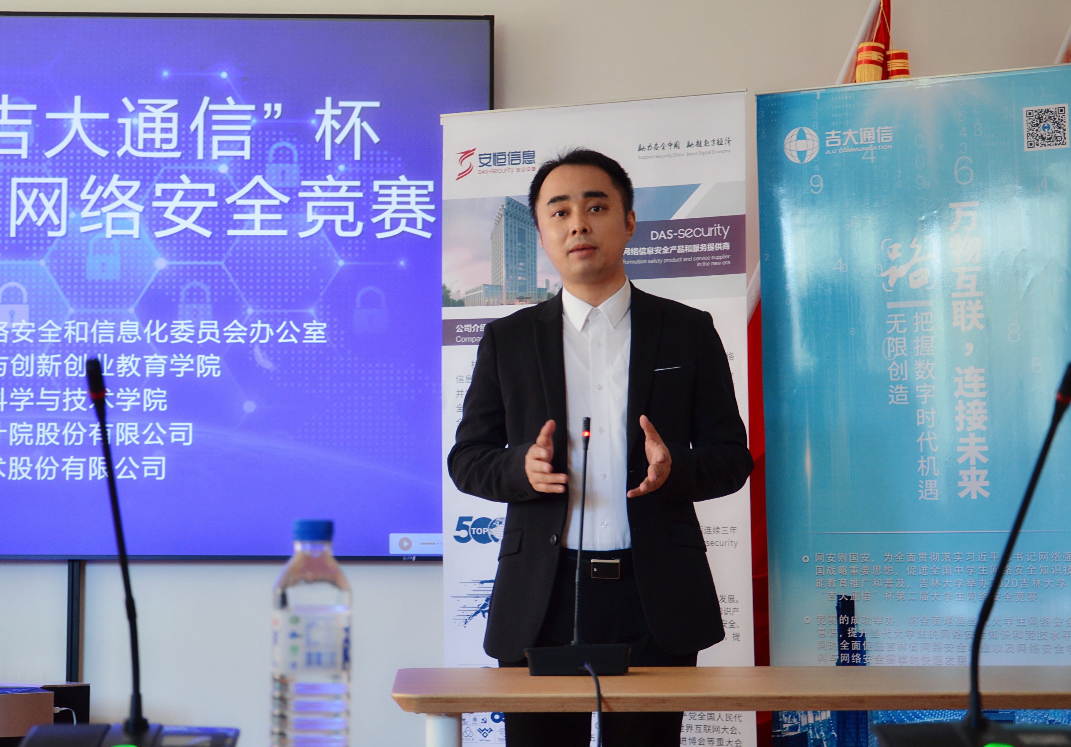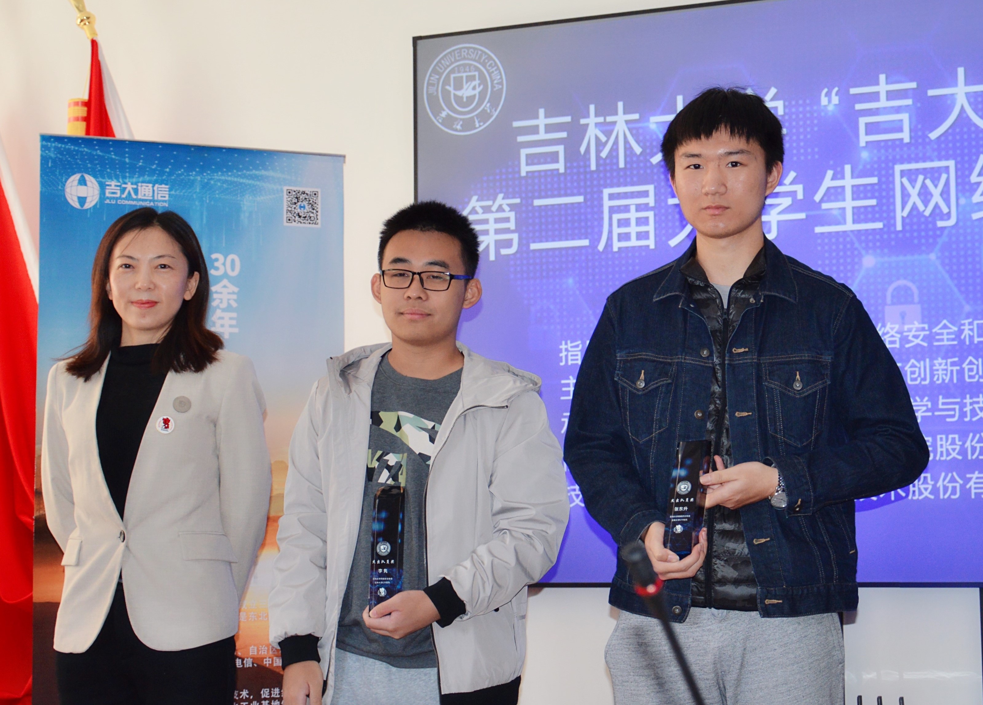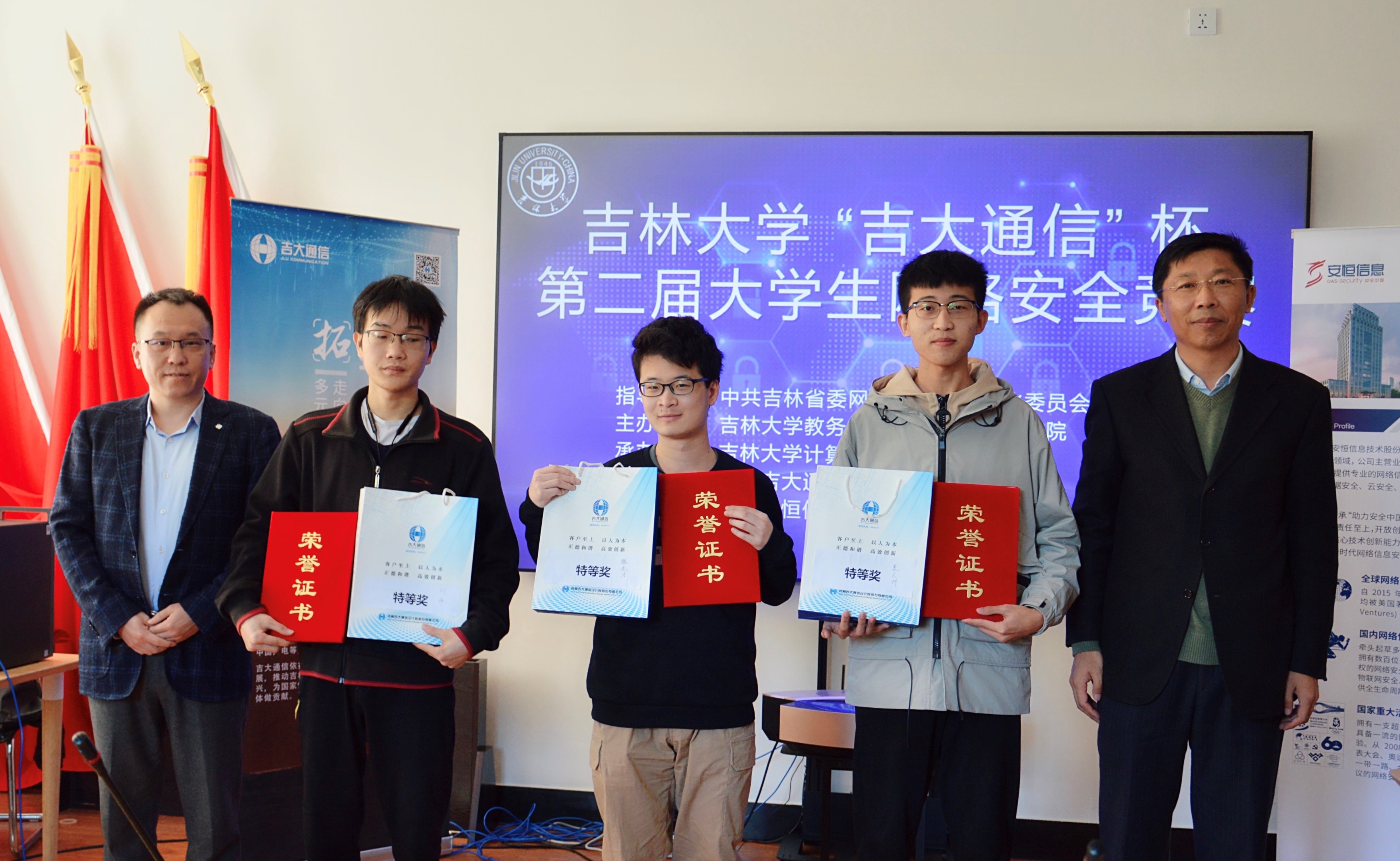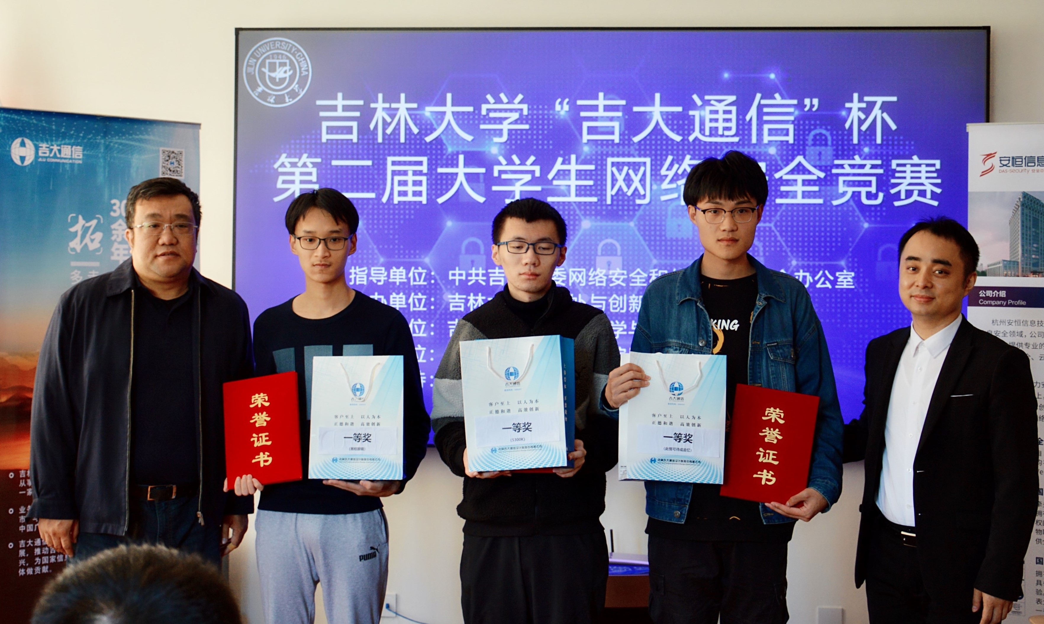 常希望和欢迎省内和国内的网络安全公司继续支持EMC易倍官网的网络安全学科发展,共同形成教育合力,为实现两个一百年奋斗目标提供动力,为实施网络强国战略贡献力量。随后,协办单位吉林吉大通信设计院股份有限公司于涛主任和技术支持单位杭州安恒信息技术股份有限公司东北区陈晖主任相继发言,祝贺竞赛圆满成功,并表示会继续加大对EMC易倍官网网络安全学科和竞赛的合作与支持。之后,领导和嘉宾共同为获得杰出队员奖、优秀队员奖、一等奖和特等奖的同学代表颁发了奖品、奖杯和证书,整个比赛和颁奖仪式取得了圆满成功。