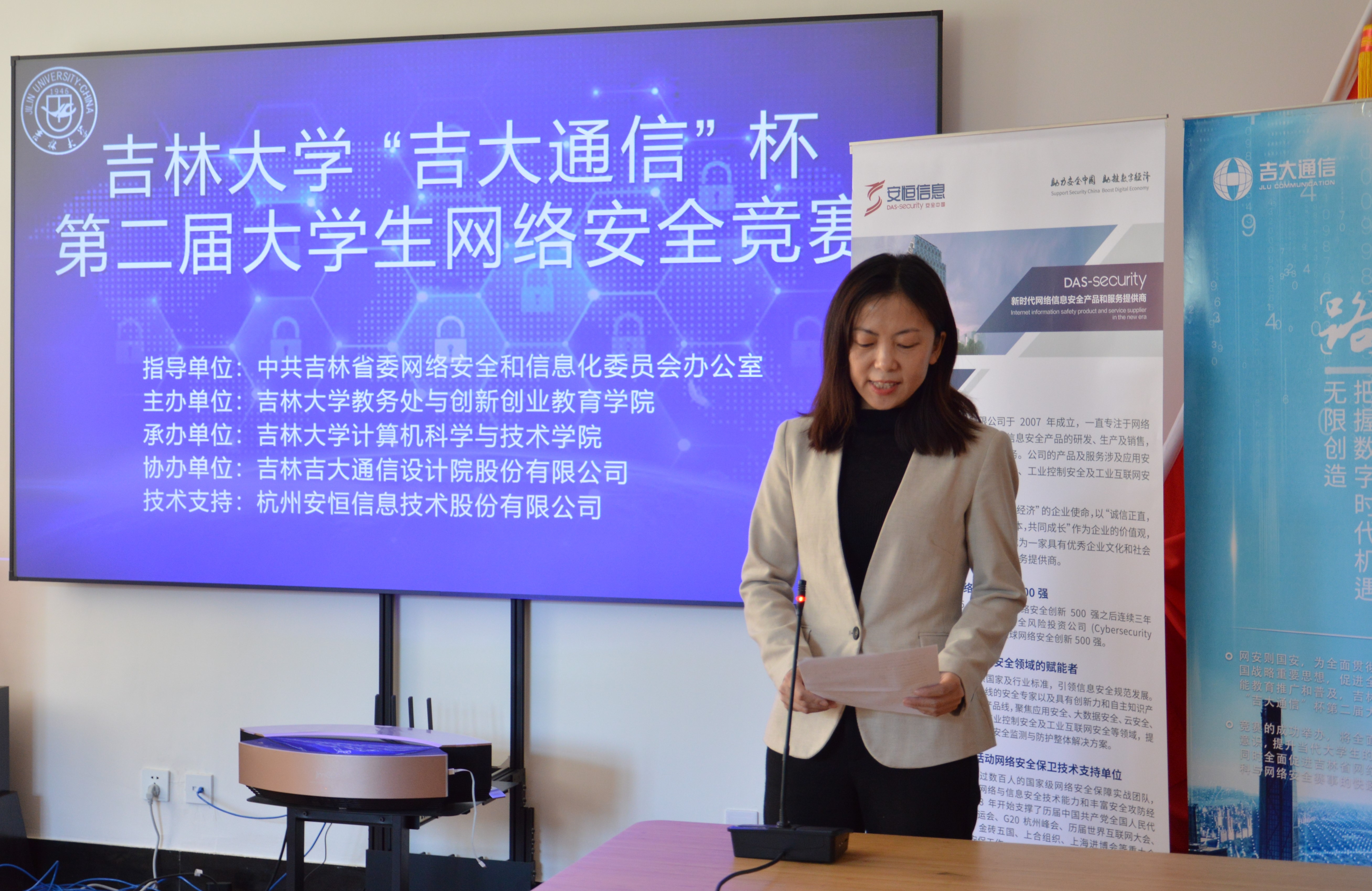 为配合疫情防控工作的需要,在10月18日举行了简短的颁奖仪式。EMC易倍官网创新创业教育公司经理、EMC易倍官网教务处副处长赵军教授,EMC易倍副经理黄岚教授,EMC易倍官网公司党委白江副书记,协办单位吉林吉大通信设计院股份有限公司于涛主任,技术支持单位杭州安恒信息技术股份有限公司东北区陈晖主任以及获奖员工代表和组委会人员参加了颁奖仪式。EMC易倍副经理黄岚教授发表了热情洋溢的讲话,她对获奖的同学表示祝贺,对协办单位吉林吉大通信设计院股份有限公司和技术支持单位杭州安恒信息技术股份有限公司的大力支持以及竞赛组委会的精心筹备表示衷心的感谢,并表示吉大人会“不忘初心、牢记使命”,EMC易倍官网网络安全学科会肩负起引领吉林省网络安全教育的责任,推动吉林省网络安全事业的发展。同时,也非