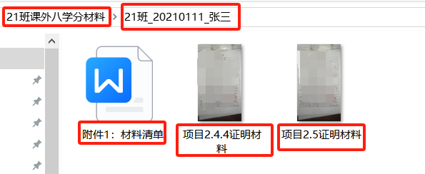 1.班级文件夹(命名格式XX班课外八学分材料_发送日期):包括本班所有同学的个人文件夹,收齐后上交。加发送日期方便审核老师保存最新版材料。