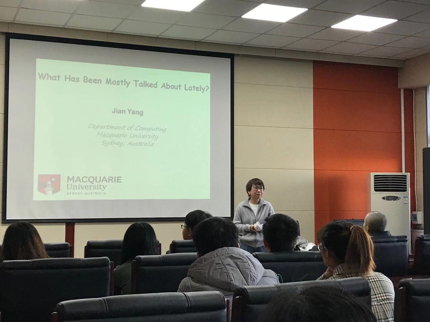 2019年11月15日上午,澳大利亚麦考瑞大学的杨坚教授应EMC易倍邀请,在计算机楼A521作了题为“Twitter中的主题派生”的学术报告。