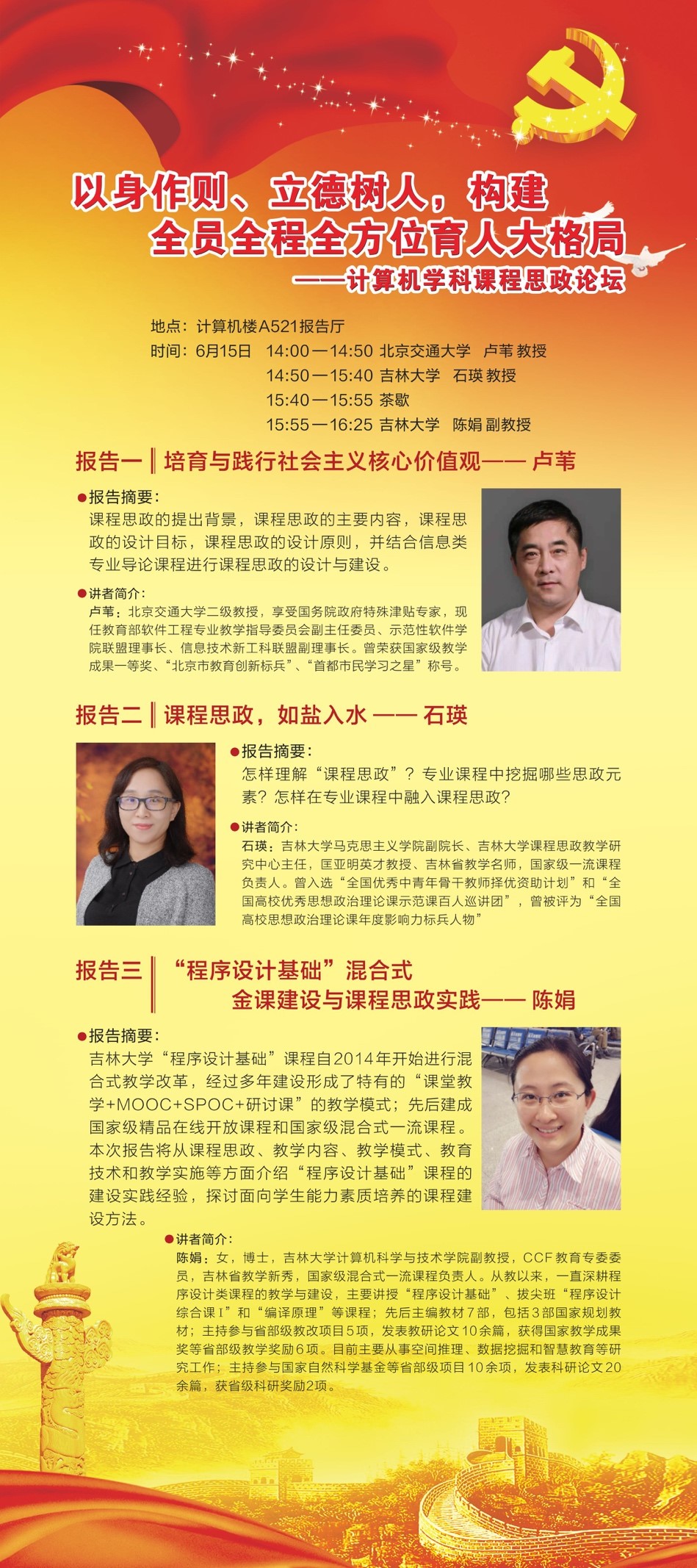 本次论坛邀请到了三位专家,他们分别是教育部软件工程专业教学指导委员会副主任委员、示范性软件公司联盟理事长、信息技术新工科联盟副理事长、北京交通大学卢苇教授,EMC易倍官网马克思主义公司副经理、EMC易倍官网课程思政教学研究中心主任、匡亚明英才教授、吉林省教学名师、国家级一流课程负责人石瑛教授,EMC易倍副教授、CCF教育专委委员、吉林省教学新秀、国家级混合式一流课程负责人陈娟副教授。