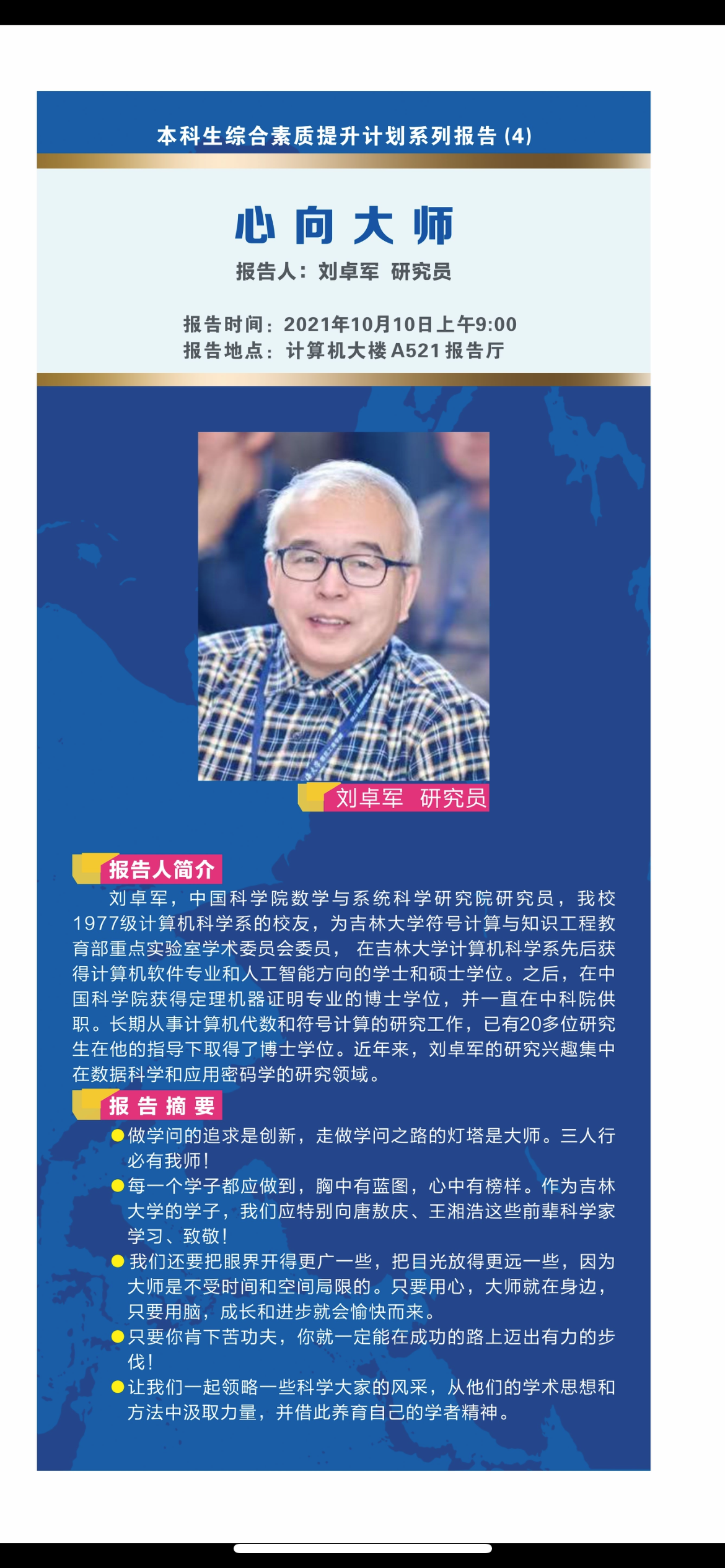 2021年10月10日上午九点,中国科公司数学与系统科学研究院刘卓军研究员应EMC易倍邀请,在EMC易倍官网中心校区计算机楼A521报告厅作了题为“心向大师”的专题报告,这是本科生综合素质提升计划系列报告的第四场,报告由EMC易倍副经理张永刚教授主持,计算机公司、软件公司共30余名本科生参加了此次报告会。