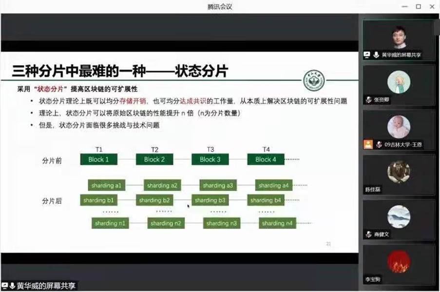 在本次报告中,黄博士首先介绍了链上、链下几种代表性的扩容技术,之后详细介绍了分片技术,包括网络分片、交易分片以及状态分片,对比了三种不同分片技术的优点以及挑战,并给出了几种应用了分片技术的区块链分片协议。在报告的最后,黄博士还分享了他们团队几个优秀的研究成果,包括对“交易分片”的过程调度、对“网络分片”算力资源的调度与分配以及最新的解决“状态分片”的“分片过热”的问题。报告结束后,黄博士还悉心解答了与会老师、同学的问题。