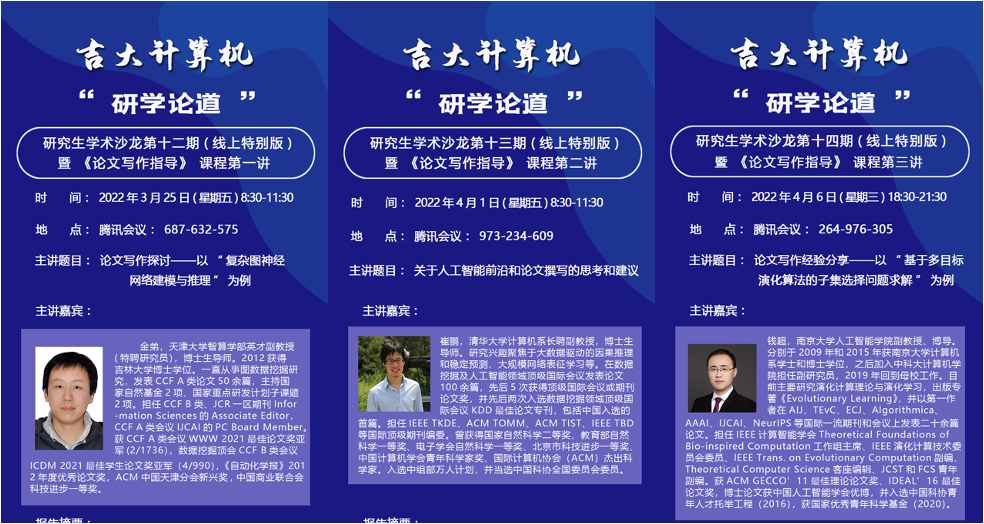 疫情当前,所有的线下课程被迫中断,公司为了让同学们能够不断汲取到新知识、了解到科研的最新动向,于是组织开展了EMC易倍“研学论道”研究生学术沙龙(线上特别版),同时这也是EMC易倍和软件公司专业必修课《论文写作指导》。公司邀请了来自计算机行业各个领域的专家教授,请他们分享各自方向的前沿动态和论文写作的独家见解,每场讲座都“座无虚席”,同学们也都以饱满的学习热情投入到学术讨论中。