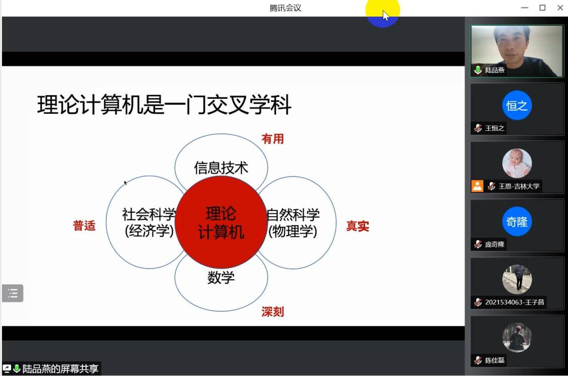 在讲座中,陆老师以理论计算机的基本概念开场,深入浅出地介绍出理论计算机的重要地位。让大家理解到理论计算机之于计算机科学,如同物理学之于工程学,是“根”一般的存在。接着,陆老师介绍了理论计算机和各个重要学科的交叉研究情况,用数学、经济学、物理学和信息学科为交叉学科代表阐述了理论计算机的重要影响。