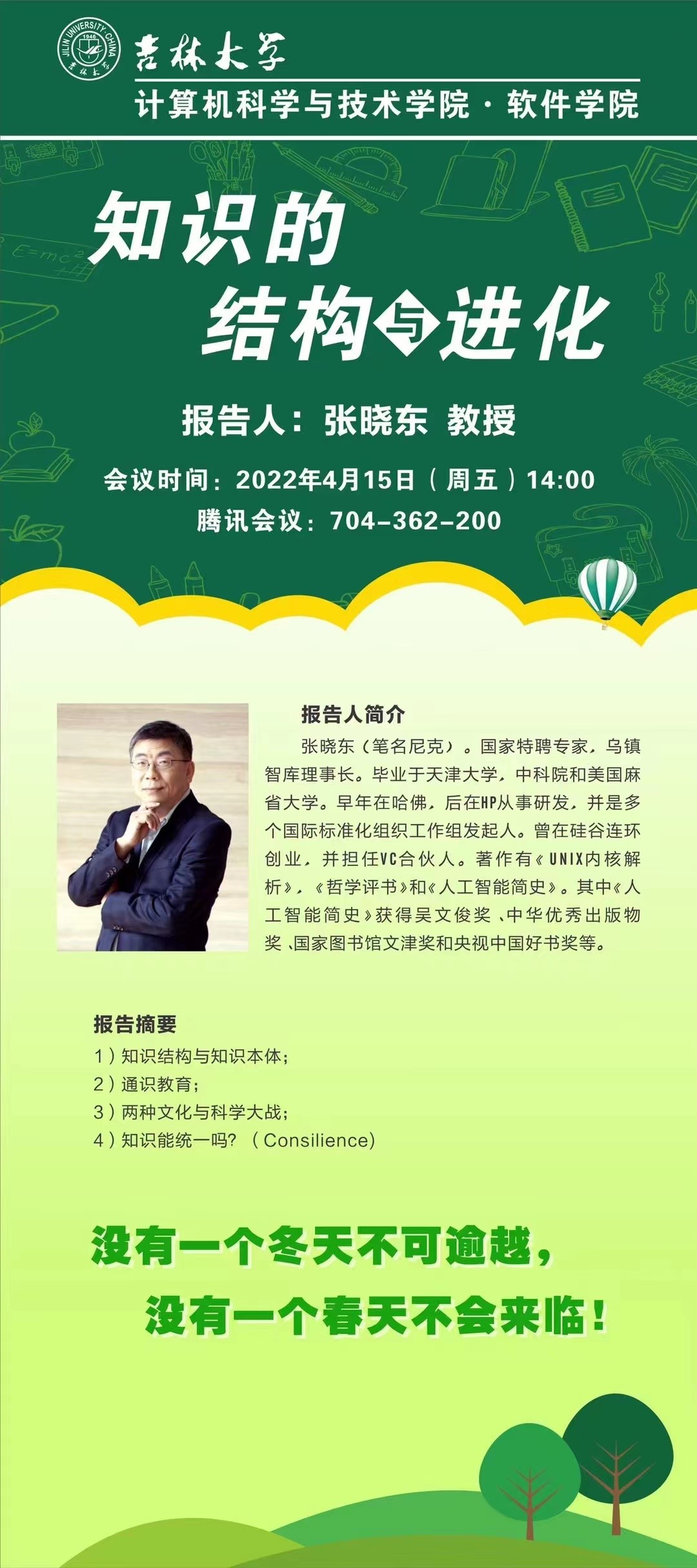 2022年4月15日14:00,国家特聘专家张晓东教授应邀利用腾讯会议作了题为“知识的结构与进化”的学术报告,也是本科生综合素质提升计划系列报告的第十场。张晓东教授这次报告是应EMC易倍、软件公司经理杨博教授邀请专门为支持计算机学科师生抗击疫情准备的,EMC易倍副经理张永刚教授主持了报告,对张晓东教授在EMC易倍官网抗击新冠疫情特殊时期应邀做专场报告表示衷心感谢。计算机公司、软件公司200余名师生在线参加了此次活动。
