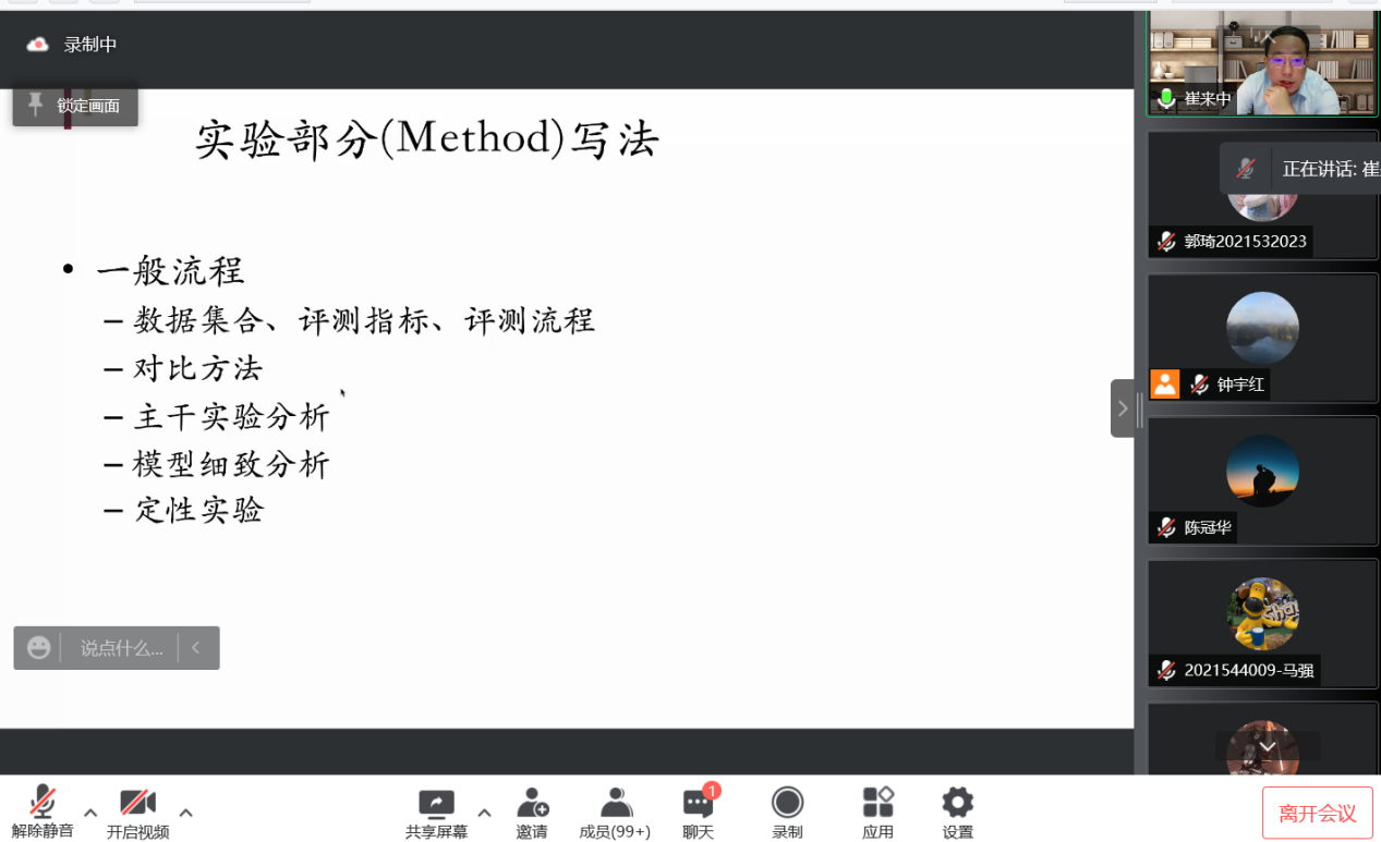 活动最后,在计算机公司副经理王喆教授的主持下,同学们就学术问题,写作技巧、学习方法等方面向崔来中老师积极提问发言,崔老师耐心地给予了同学们解答和建议。师生热烈交流,学术氛围浓厚。至此,本学期的论文指导写作课程,以及线上特别版学术沙龙圆满落下帷幕。在本学期的讲座中,两院的同学们在四位老师的指导下不仅获得了学术上的引领与支持,更开阔了视野,提升了论文写作水平。在疫情之中保持浓厚的学习兴趣与刻苦的钻研精神。相信在不久的将来,疫情结束,春暖花开,同学们会带着这段时间学习到的知识,以饱满的热情投入到下一阶段紧张而充实的科研工作之中。