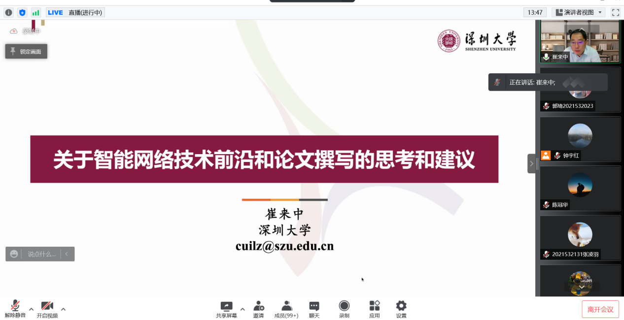 2022年4月20日晚六点半,EMC易倍官网计算机公司研究生学术沙龙第十五期(线上特别版)暨《论文写作指导》课程第四讲顺利开讲,本期特别邀请到了深圳大学计算机与软件公司教授,博士生导师崔来中老师。崔教授以“关于智能网络技术前沿和论文撰写的思考及建议”为题目,为同学们带来论文写作指导课程的最后一讲,也意味着线上特别版研究生学术沙龙告一段落。