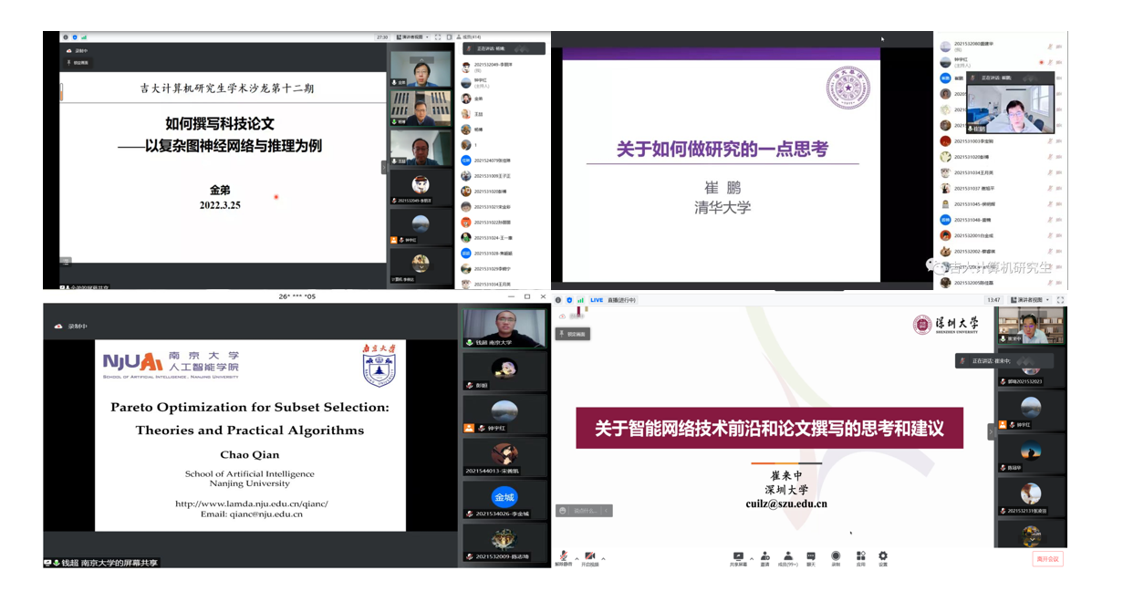 本次活动从2022年3月25日至4月20日,共分四个上午进行。天津大学的金弟副教授、清华大学崔鹏副教授、南京大学钱超副教授和深圳大学崔来中教授四位老师进行分享。分享主题涵盖了复杂神经网络、人工智能前沿、演化计算智能及智能网络技术前沿。同时,四位老师也为两院师生们就“如何选题”、“如何写好论文”等有关论文写作方面的问题给出了宝贵建议。系列课程受到了EMC易倍、软件公司、人工智能等公司师生的热烈欢迎与广泛认可,活动累计参与人数达到2300余人次。