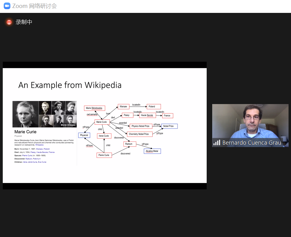 首先,王英教授对Bernardo Cuenca Grau教授表示热烈欢迎和感谢,并向与会师生简要介绍了Bernardo Cuenca Grau教授的学术成就。接下来,Bernardo Cuenca Grau教授以居里夫人的学术和生活场景为例,生动形象地展示了以wikipedia数据为代表的知识图谱的实际用途;通过谷歌、微软、IBM、联想等公司对于知识图谱的应用,中肯客观的论述了知识图谱在当今信息产业问答、自然语言处理、垂直领域搜索等领域的重要支撑地位;从而引出了知识图谱的主要框架、标准、构建方法以及技术手段,并对于知识图谱相关领域的科研挑战和前沿成果进行了简介。