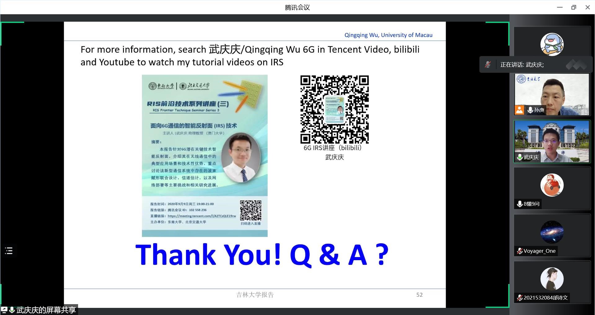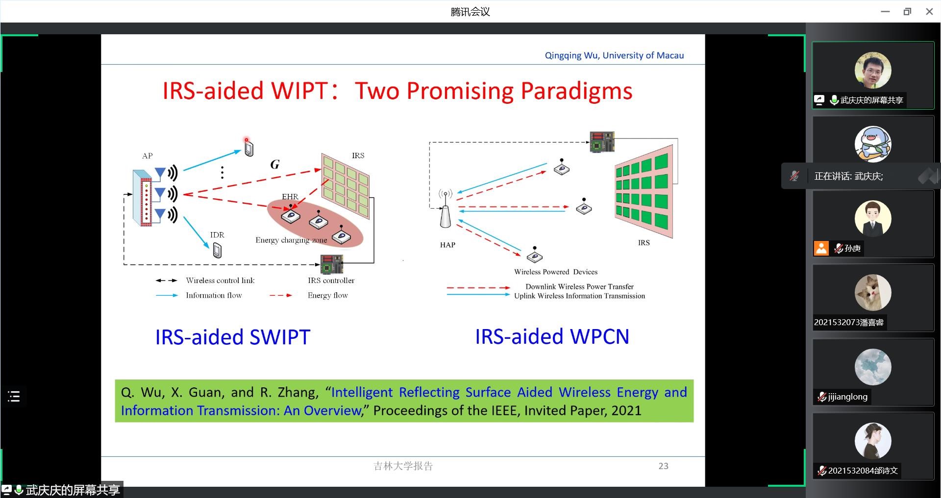 2022年9月18日,澳门大学武庆庆助理教授应EMC易倍邀请,利用腾讯会议作了题为“Intelligent Reflecting Surface Empowered Wireless Information and Energy Transmission for 6G”的学术报告。EMC易倍孙庚副教授主持了讲座,并对武庆庆助理教授的精彩讲座表示由衷地感谢。