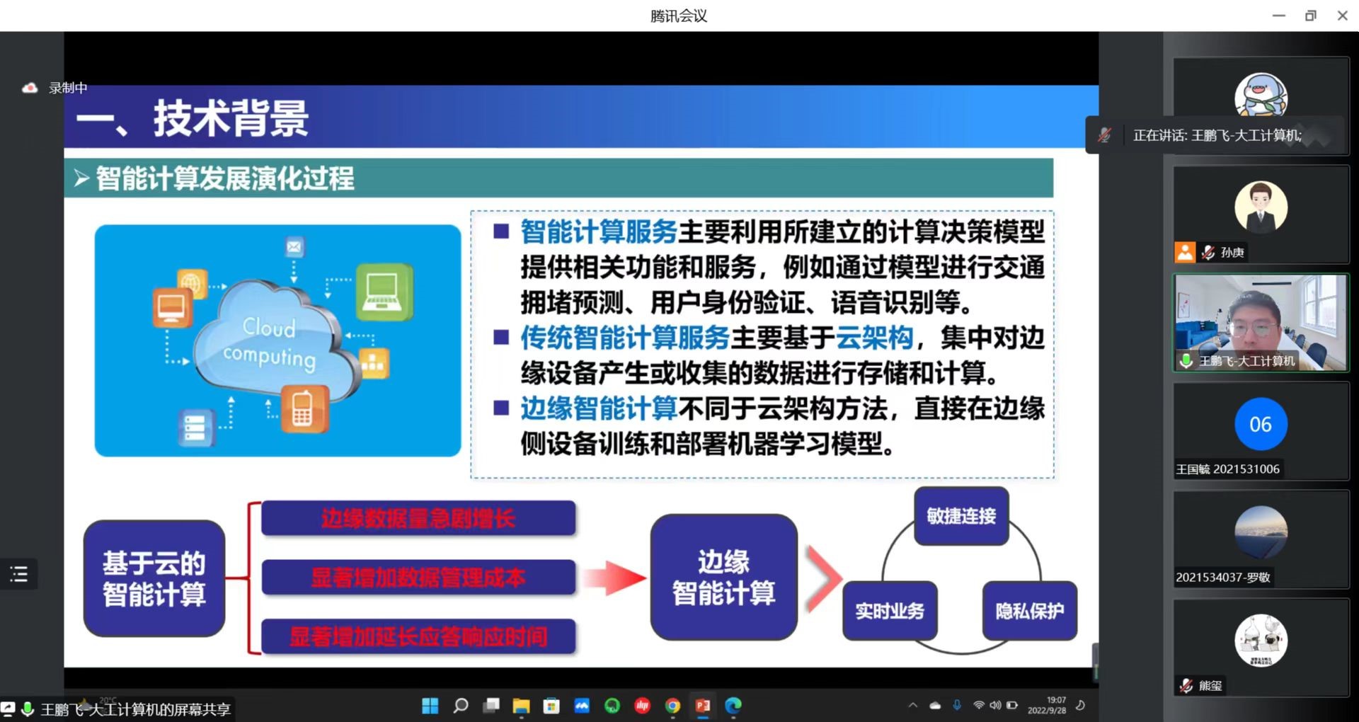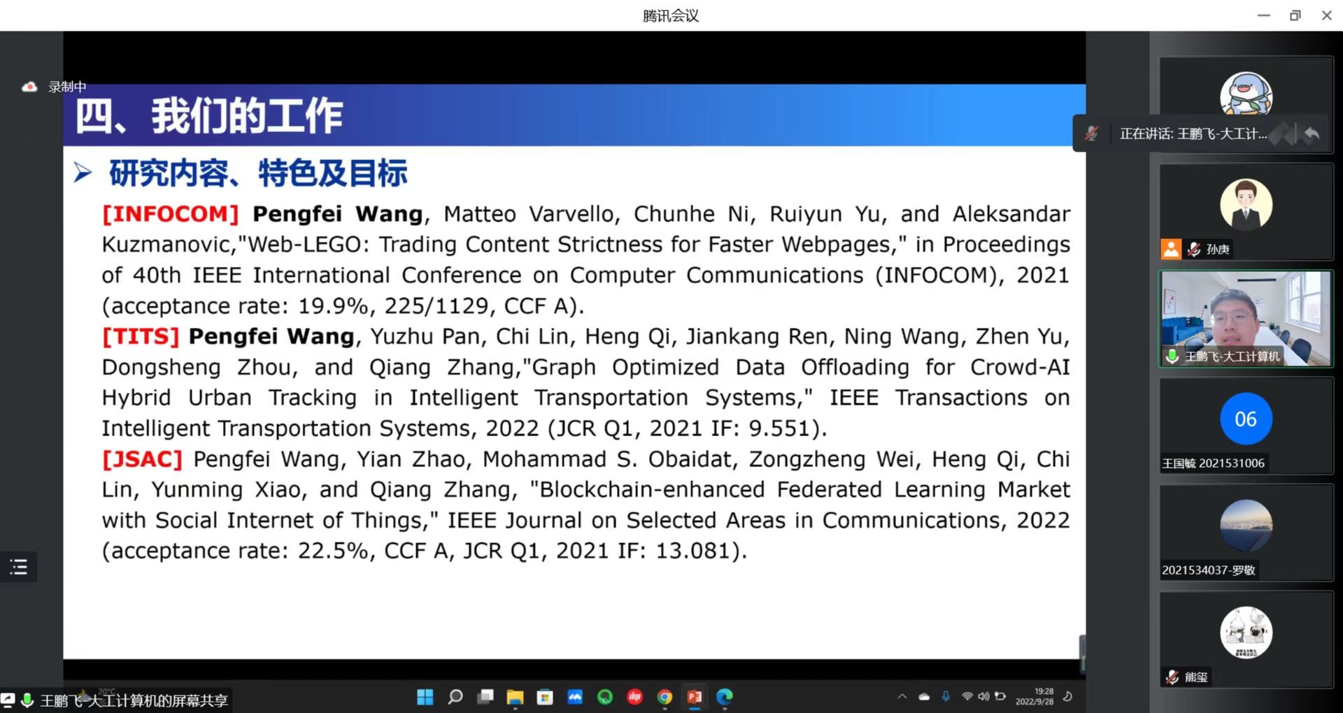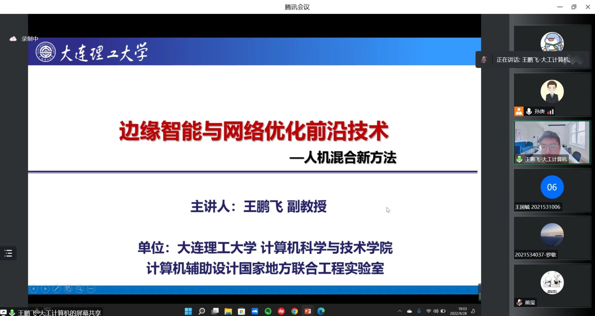 2022年9月28日,大连理工大学王鹏飞副教授应EMC易倍邀请,利用腾讯会议作了题为“边缘智能与网络优化前沿技术”的学术报告。EMC易倍孙庚副教授主持了讲座。