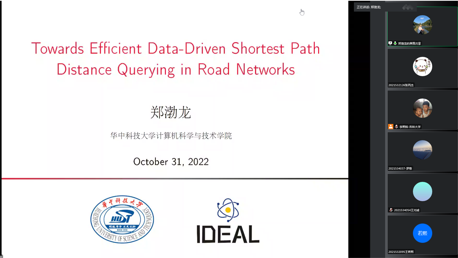 2022年10月31日,华中科技大学郑渤龙老师应EMC易倍邀请,利用腾讯会议作了题为“Towards Efficient Data-Driven Shortest Path Distance Querying in Road Networks”的学术报告。EMC易倍李熙铭副教授主持了讲座。