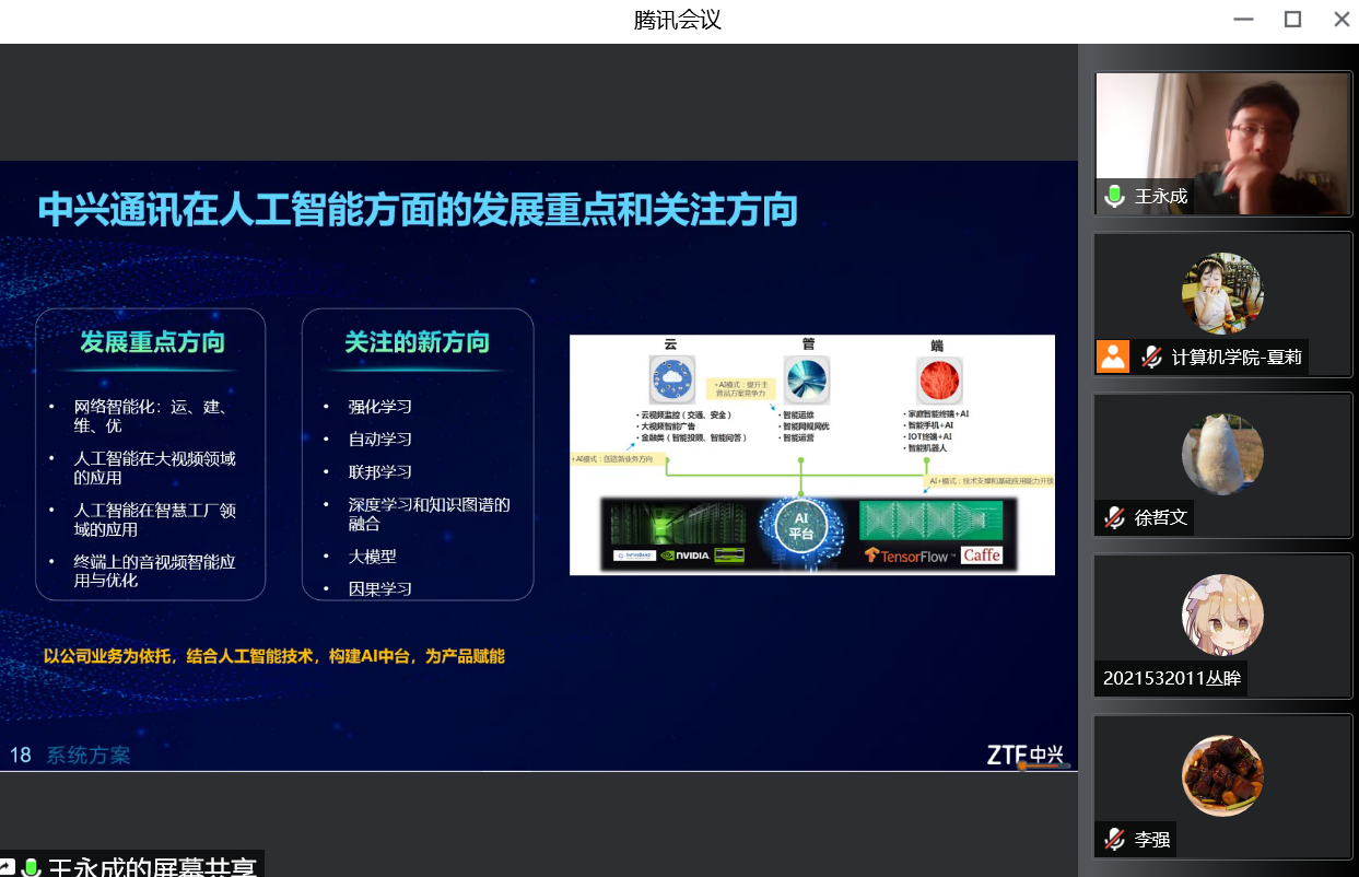 2022年11月24日,中兴通讯股份有限公司数据智能系统部部长王永成应EMC易倍邀请,以线上腾讯会议的形式为计算机科学与技术公司的老师和同学们作了题为“人工智能技术的发展及在企业中的应用”的学术报告,EMC易倍副经理李强教授主持了本次报告。