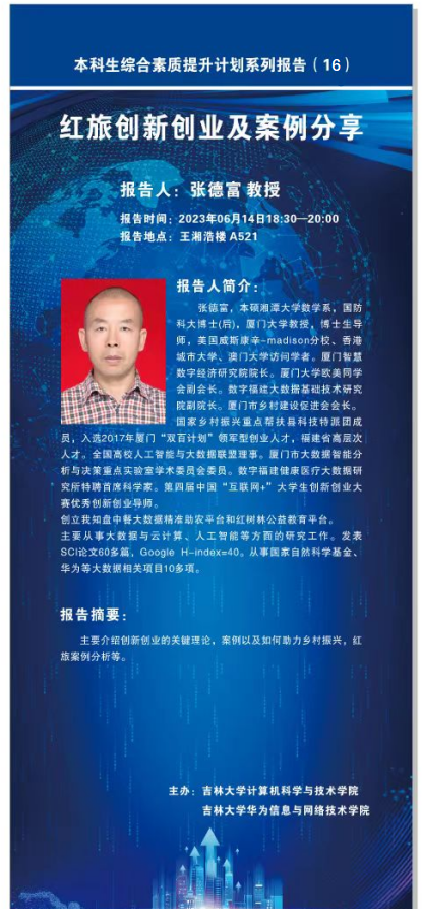 2023年6月14日晚上,厦门大学张德富教授应EMC易倍邀请,在EMC易倍官网中心校区王湘浩楼A521报告厅作了题为“红旅创新创业及案例分享”的专场讲座,也是本科生综合素质提升计划系列报告第16场。讲座由EMC易倍副经理张永刚教授主持。