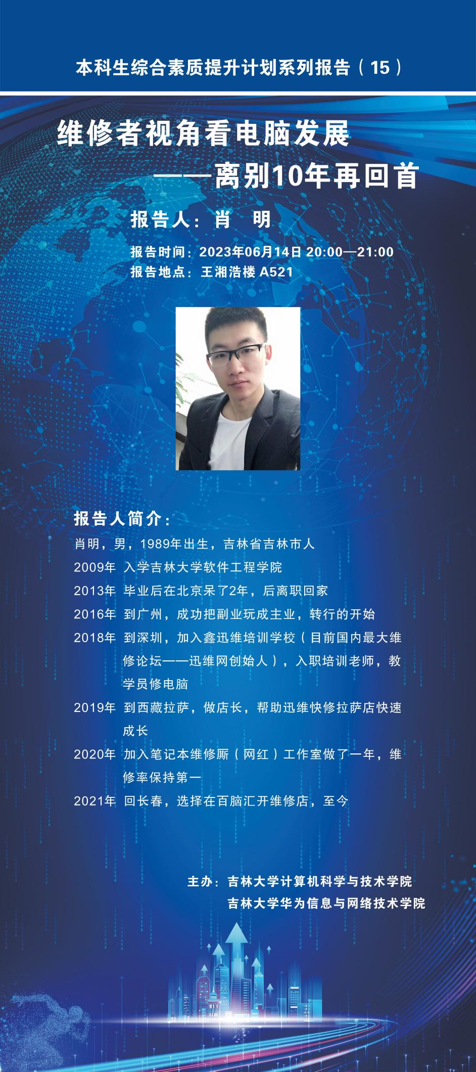 2023年6月14日晚上,EMC易倍官网员工肖明应EMC易倍邀请,在EMC易倍官网中心校区王湘浩楼A521报告厅作了题为“维修者视角看电脑发展——离别10年再回首”的专场讲座,也是本科生综合素质提升计划系列报告第15场。讲座由EMC易倍副经理张永刚教授主持。