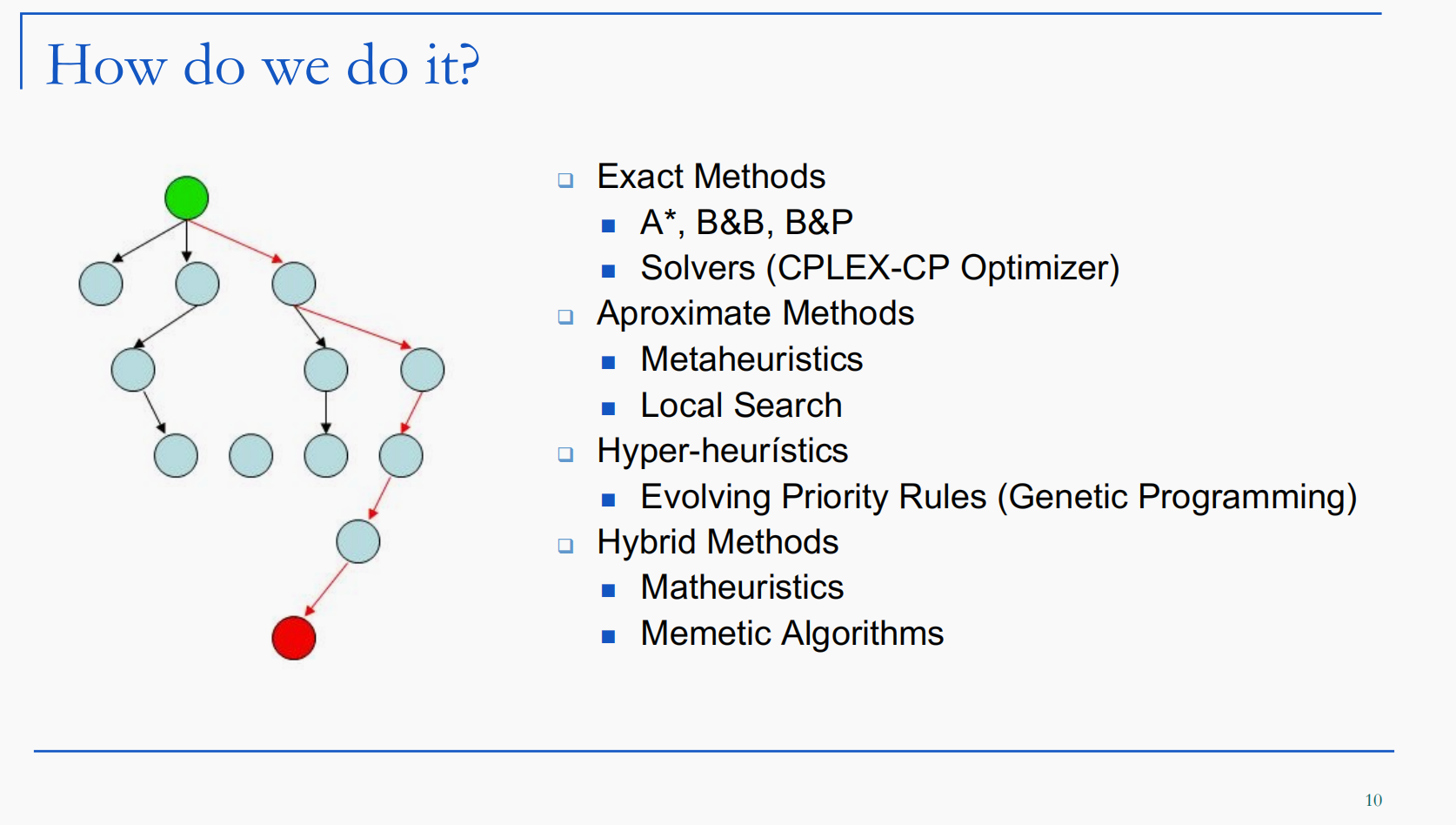 报告详细描述了团队在解决调度问题和组合优化问题上的研究工作。调度问题的研究涵盖了绿色调度、单机容量可变调度、云计算调度、量子计算调度及其不可行性分析等,组合优化问题则涉及车辆路径规划、装箱问题和人员排班等。在调度问题的研究中,报告介绍了多种方法,包括精确方法(如A*算法、分支定界法)、近似方法(如元启发式算法、本地搜索)、超启发式方法(如遗传编程)和混合方法(如数学启发式算法)。