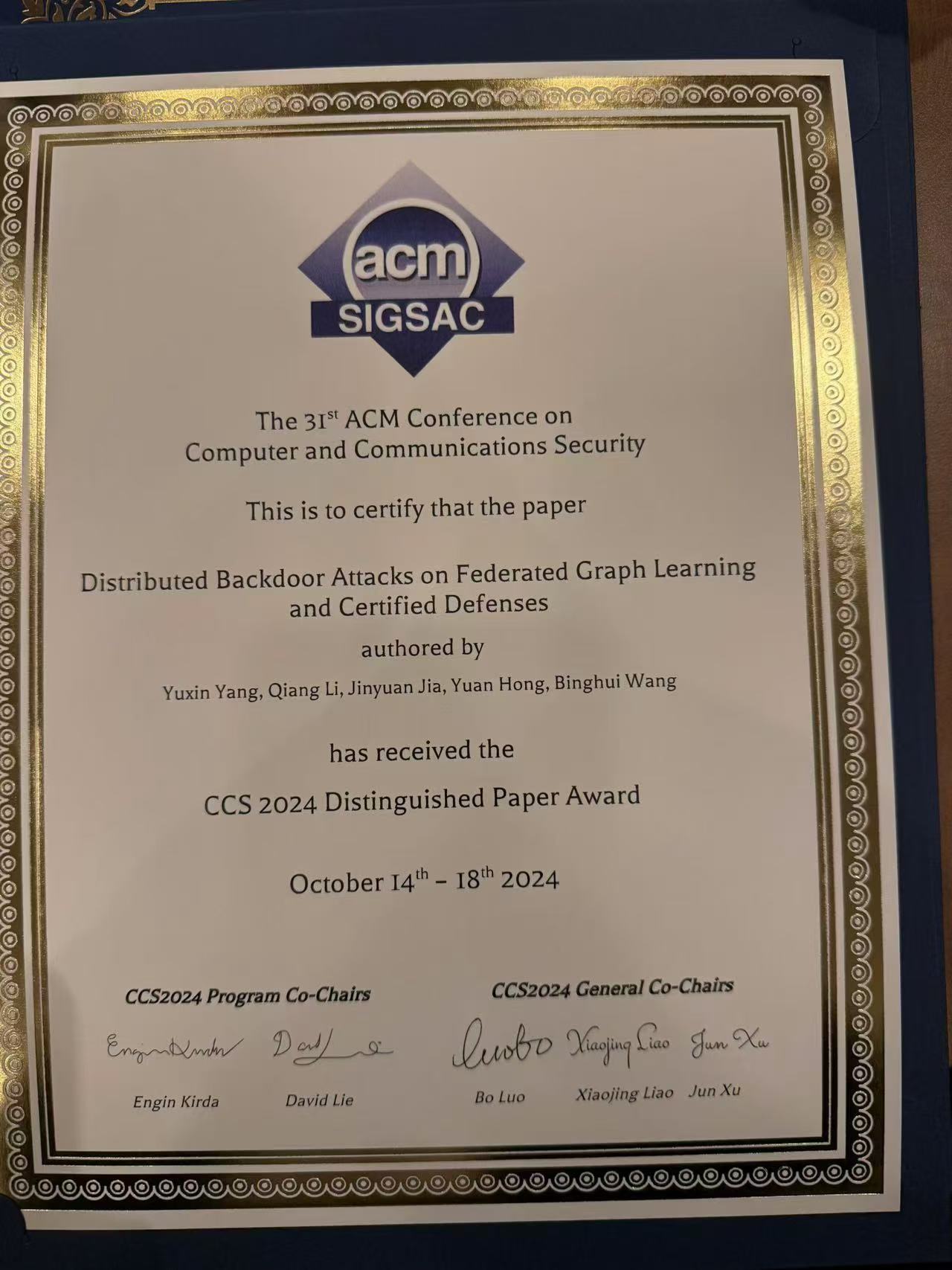 EMC易倍2022级博士生杨雨欣获得ACM CCS 2024(ACM Conference on Computer and Communications Security)最佳论文奖。ACM CCS是国际上网络与信息安全的四大顶会之一,是CCF推荐A类会议。