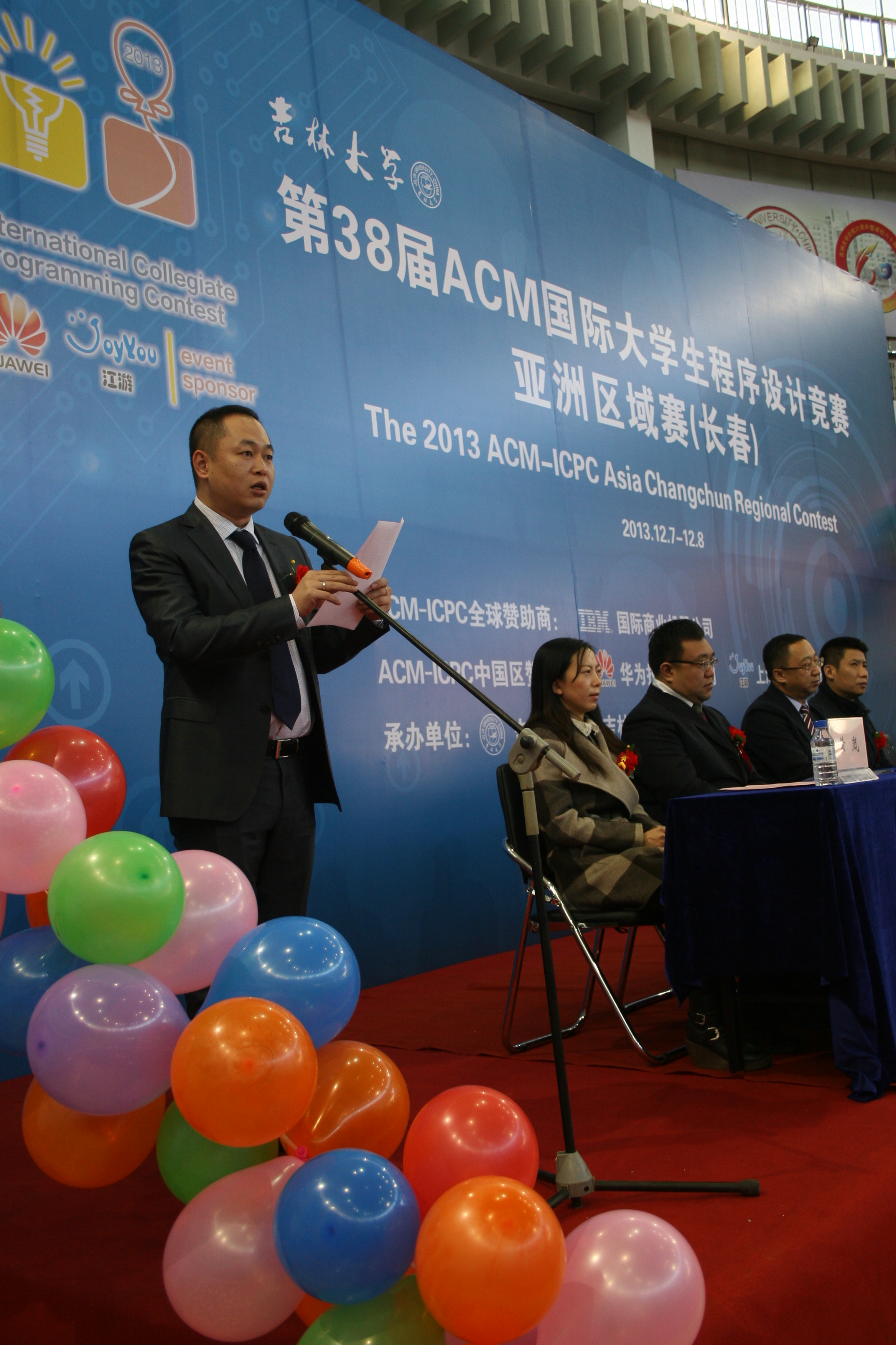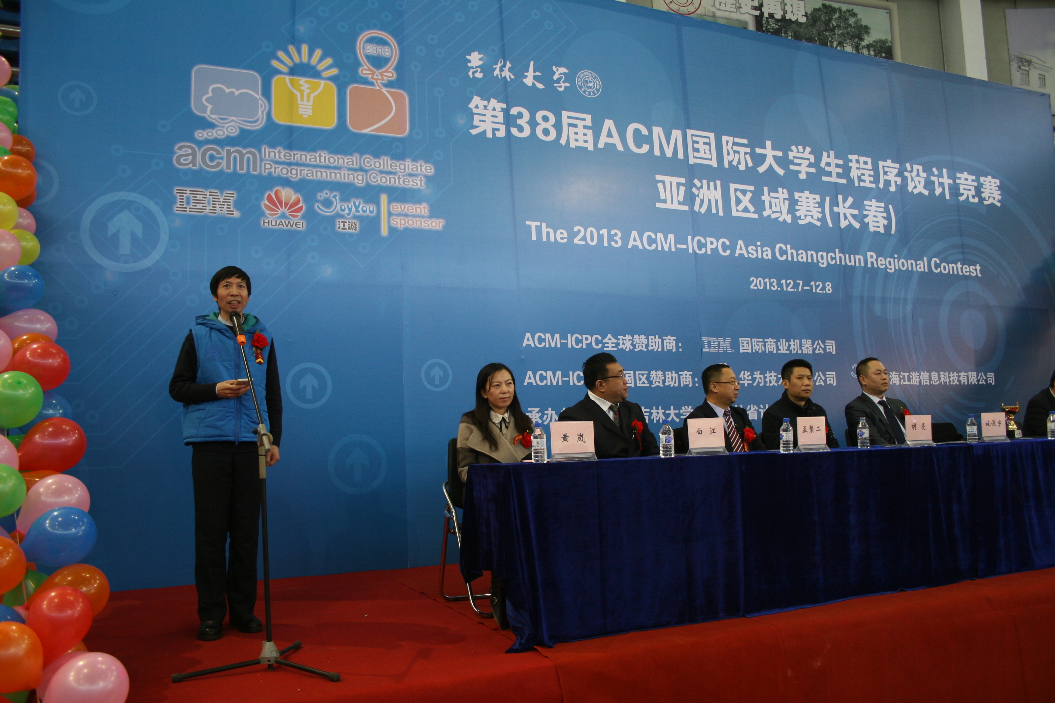 竞赛开幕式于12月7日下午1点准时开始。出席开幕式的嘉宾有ACM-ICPC中国区指导委员会秘书长、上海大学周维民教授,全球赞助商IBM公司长春分公司总经理施俊宇先生,EMC易倍官网党委副书记韩晓峰教授,EMC易倍官网教务处处长胡亮教授,EMC易倍经理、软件公司经理、吉林省计算机学会理事长魏晓辉教授,以及EMC易倍和软件公司的相关领导。开幕式由EMC易倍副经理黄岚教授主持。开幕式上EMC易倍官网党委副书记韩晓峰教授致欢迎词,他对各高校师生的到来表示热烈的欢迎,对全球赞助商IBM公司和中国赛区赞助商华为技术有限公司、上海江游信息科技有限公司的热情赞助表示衷心的感谢,EMC易倍官网能够举办第38届ACM-ICPC国际老员工程序设计竞赛感到非常的荣幸,预祝本次竞赛取得圆满成功,预祝选手取得优异的成绩。随后,ACM-ICPC中国区指导委员会秘书长、上海大学周维民教授致辞,他对EMC易倍官网,吉林省计算机学会的精心准备表示衷心感谢,对各高校师生的热情参与表示热烈欢迎,对EMC易倍官网在ACM竞赛曾经取得的佳绩表示热烈祝贺。接着,全球赞助商IBM公司长春分公司总经理施俊宇先生发表了讲话,他表示IBM始终如一地支持此项赛事,期望未来与高校有更多的合作,为中国的教育事业贡献一份心力。最后,教练代表天津大学计算机公司副书记于瑞国教授,队员代表杭州电子科技大学李镇同学做了发言。开幕式结束以后进入了3个小时的热身赛。热身赛期间在计算机大楼召开了1个小时的教练会。
