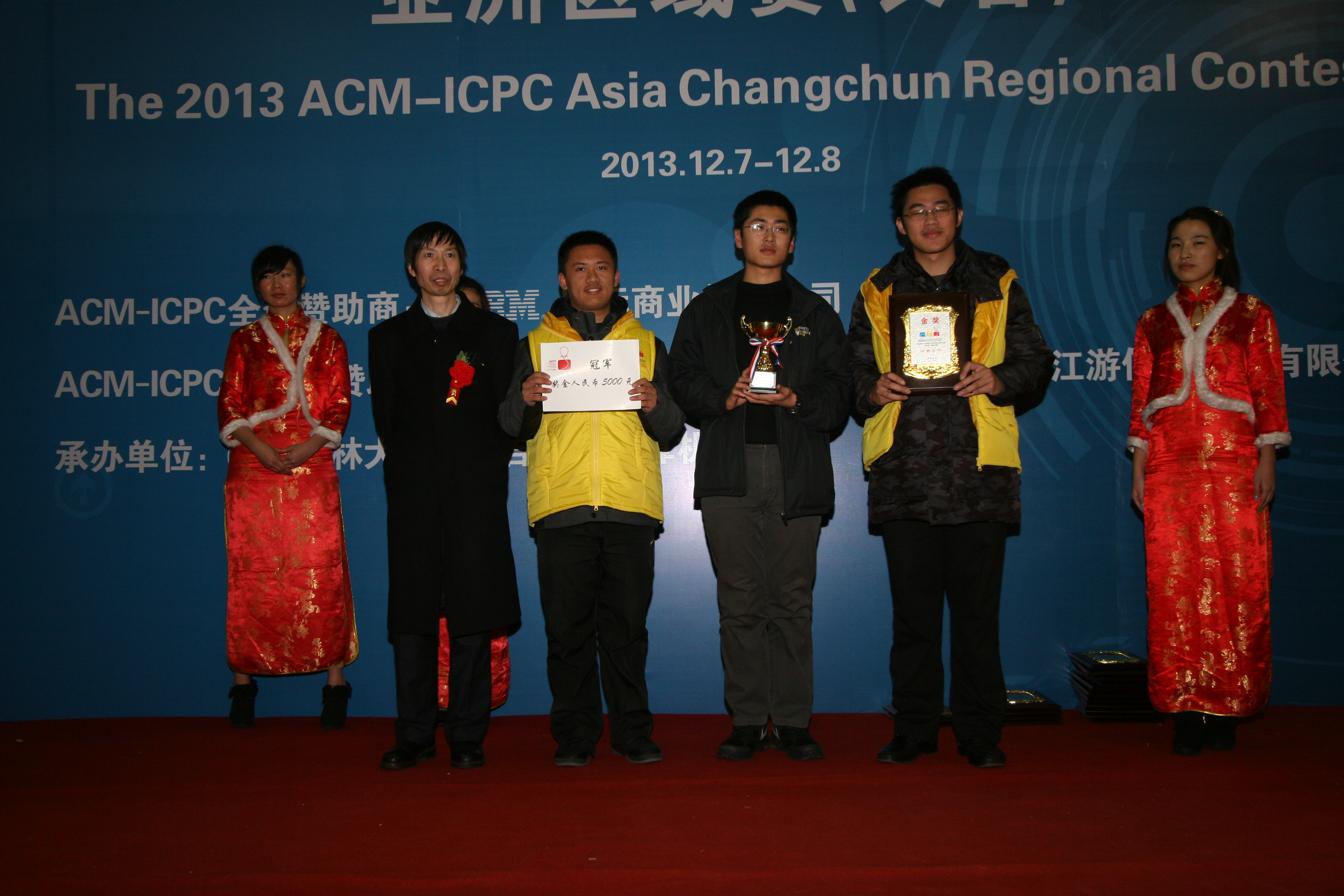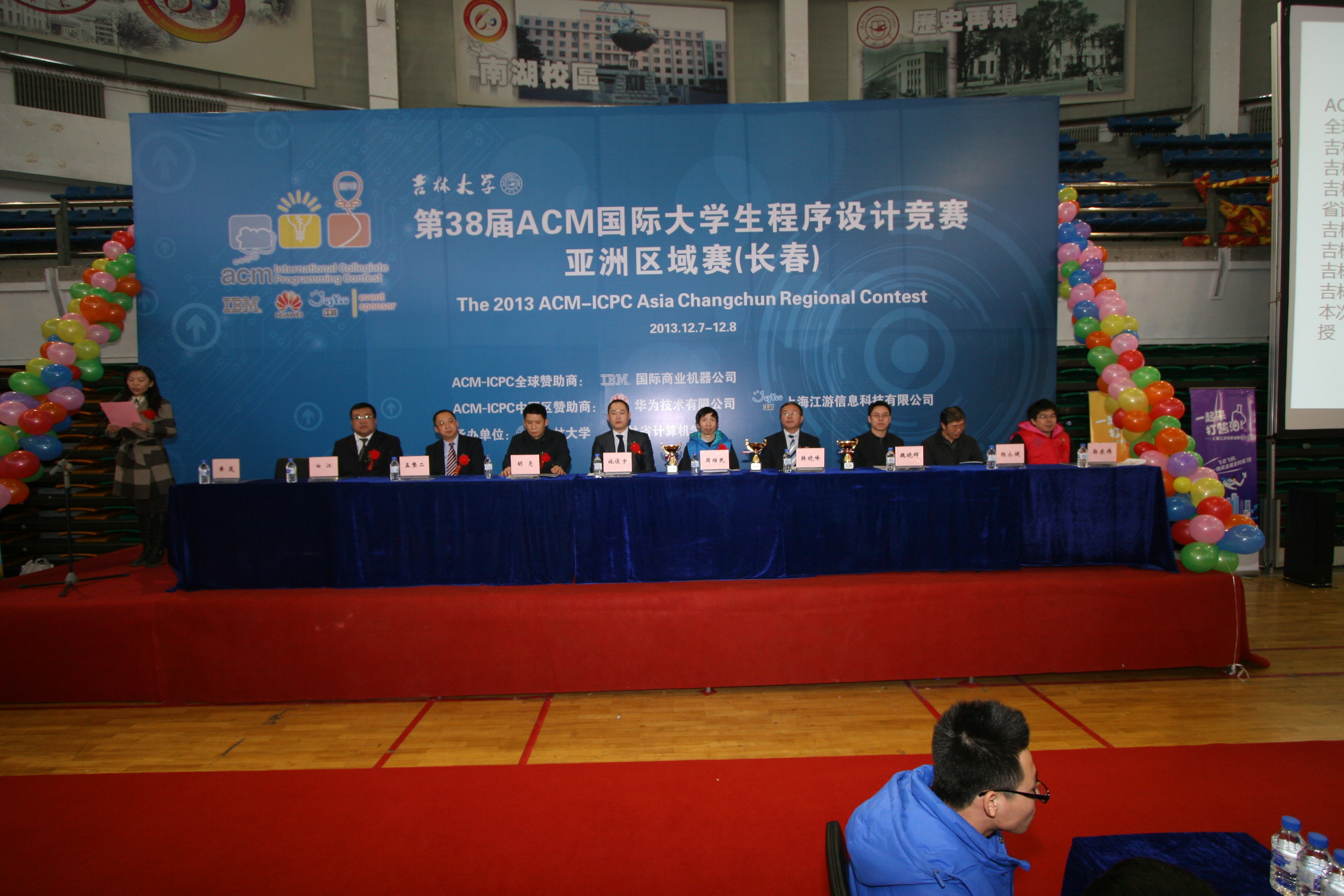 下午4点,第38届ACM国际老员工程序设计竞赛(ACM-ICPC)亚洲区域赛颁奖仪式正式开始,出席颁奖仪式的嘉宾有ACM-ICPC中国区指导委员会秘书长、上海大学周维民教授,华为技术有限公司北京研究所招聘经理白冰先生,上海江游信息科技有限公司人力资源部经理刑雪女士,EMC易倍经理、软件公司经理、吉林省计算机学会理事长魏晓辉教授以及EMC易倍和软件公司的相关领导。竞赛主裁判郭东伟教授对本次竞赛进行总结,大屏幕滚动显示参赛队伍排名及答题情况,郭教授宣读获奖名单,同时获奖代表队上台领奖。本次比赛有15支代表队获得金奖, 30支代表队获得银奖,63支代表队获得铜奖。比赛还设置了10个最快解题奖,2个顽强拼搏奖。获得竞赛冠亚季军的代表队分别是上海交通大学CamEo队、清华大学 LJQ队、 华南理工大学 SCUT_Yamiedie队,颁奖仪式在热烈和谐的气氛中结束。按照ACM-ICPC竞赛规则的安排,承办单位EMC易倍官网和出题评判单位中山大学均不参加此次比赛。