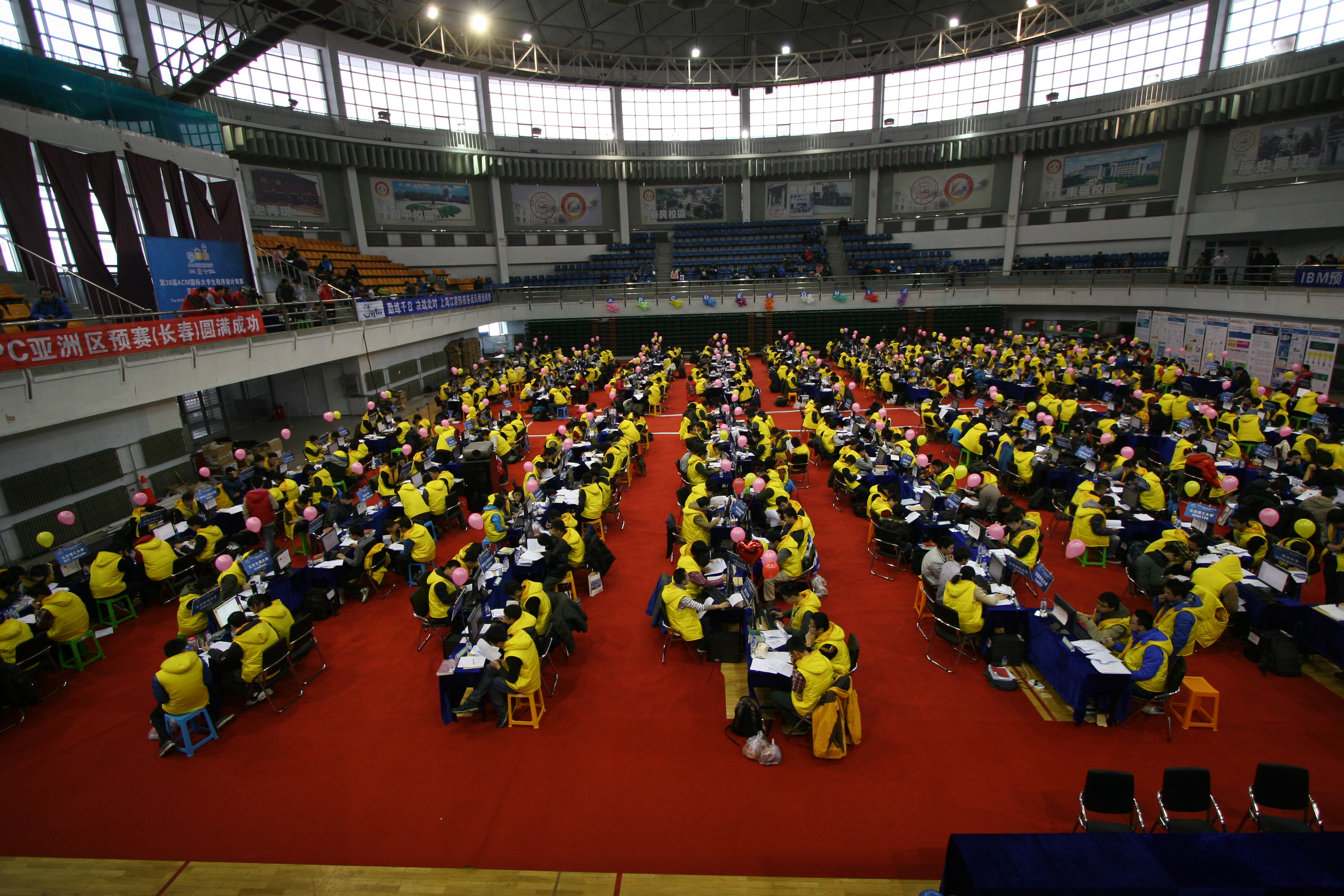 正式比赛于12月8日上午9点在EMC易倍官网体育馆如期进行。每只队伍由3名队员组成,队员身着黄马甲在赛场比赛,教练身着蓝马甲在二楼看台观看比赛。比赛期间,每队使用1台电脑需要在5个小时内解决10道题,每道题对应不同颜色的气球,每答对一道题,身着红马甲的工作人员即在本队前方插上相对应颜色的气球。整个赛事紧张有序地进行。开赛仅2分钟,上海交通大学CamEo队解出了第一道题,获得第一个气球。随着赛事的推进,体育馆内彩球越来越多,场内气氛非常活跃。比赛进行到最后1小时赛事排名榜单停止了更新,场内气氛愈加激烈紧张,很多队员加紧了最后的冲刺。