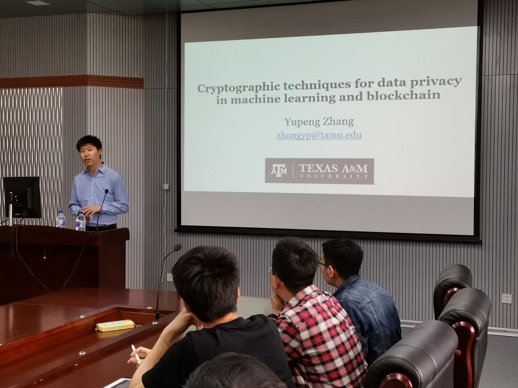 2019年5月10日上午,美国德州农工大学(TAMU塔木)助理教授张宇鹏博士应EMC易倍邀请,在计算机楼A515作了题为“机器学习和区块链中数据隐私的加密技术”的学术报告。