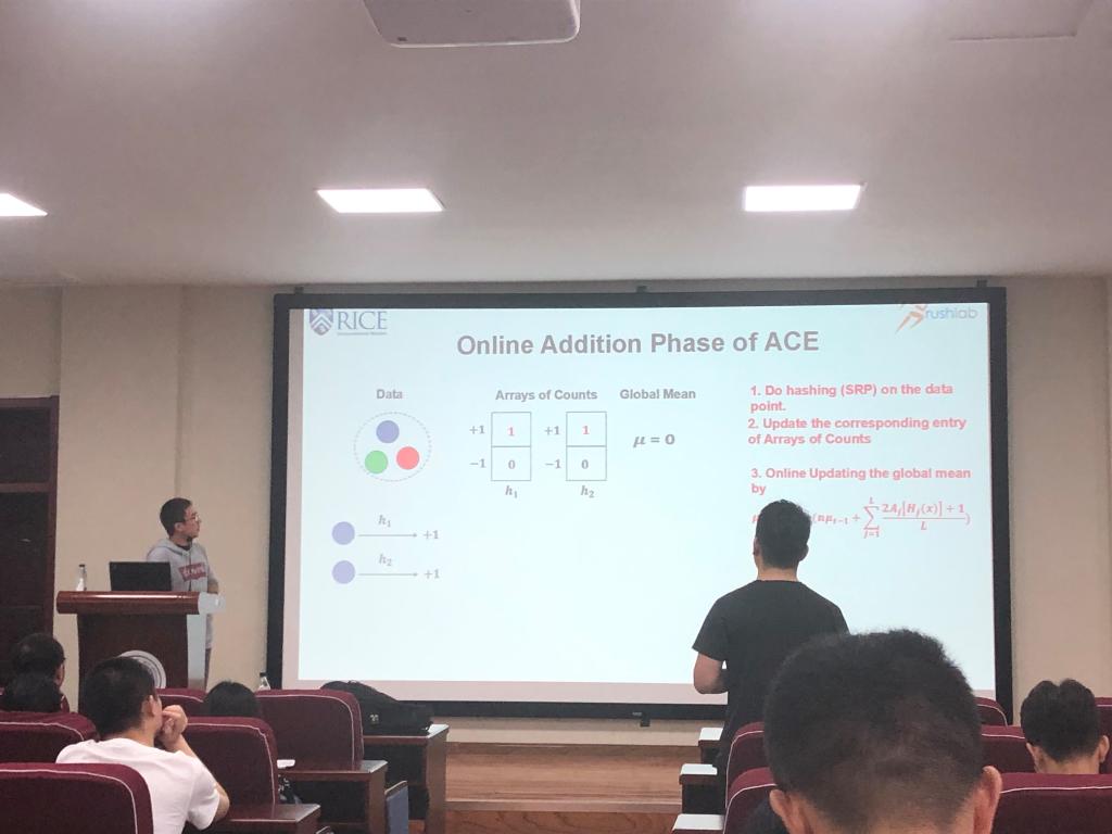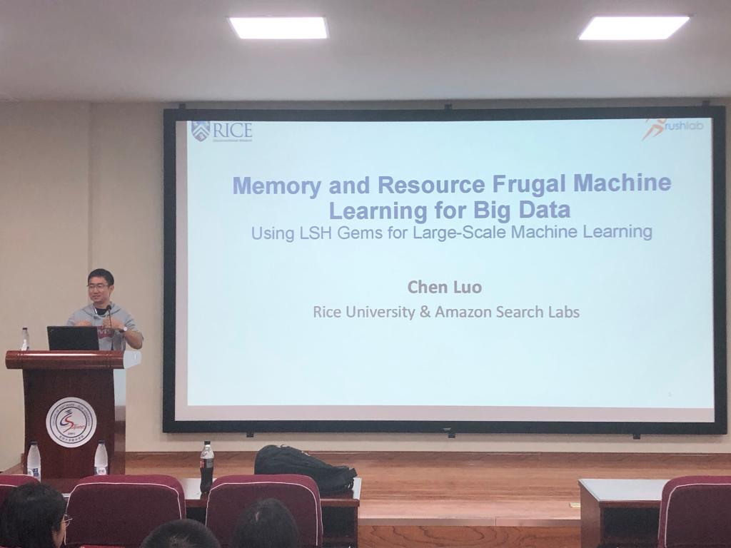 2019年8月19日上午,亚马逊搜索实验室罗琛博士应EMC易倍邀请,在计算机楼B108作了题为“Memory and Resource Frugal Machine Learninig for Big Data”的学术报告。