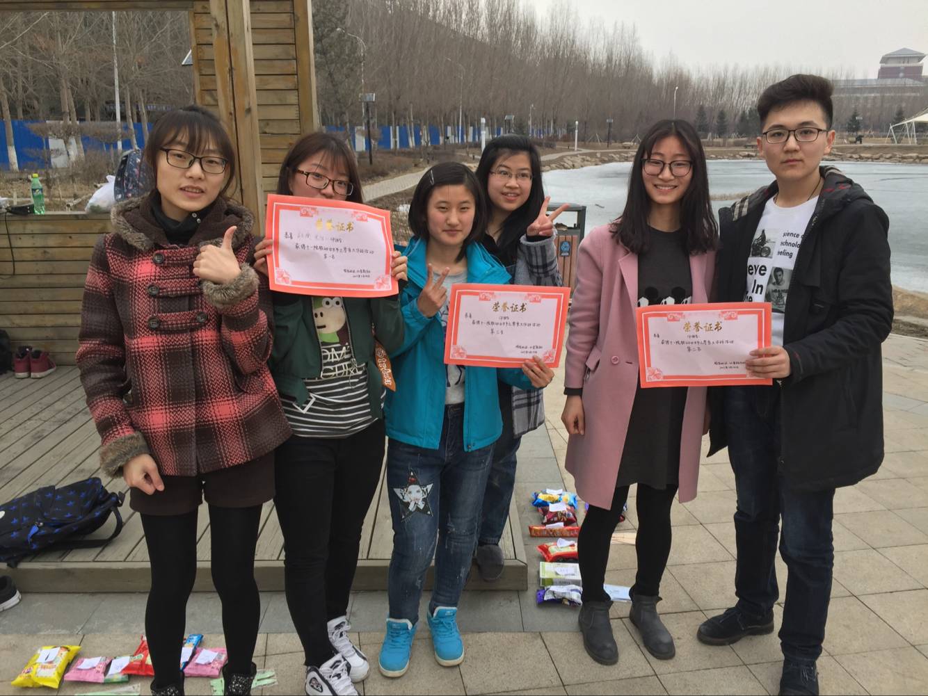 本次活动的起始地点为青湖。3时,主持人开始讲解活动的具体内容。同学们需要到日新楼,莘子园,新食堂三个地点,找到具有特征的工作人员,并且对上相应的暗号,完成工作人员指定的任务,方可获得带有汉字的零食。不同地点的人员有的字不同。只有集齐“女”“生”“节”“快”“乐”“!”这六种字并且回到起点,才算完成任务。